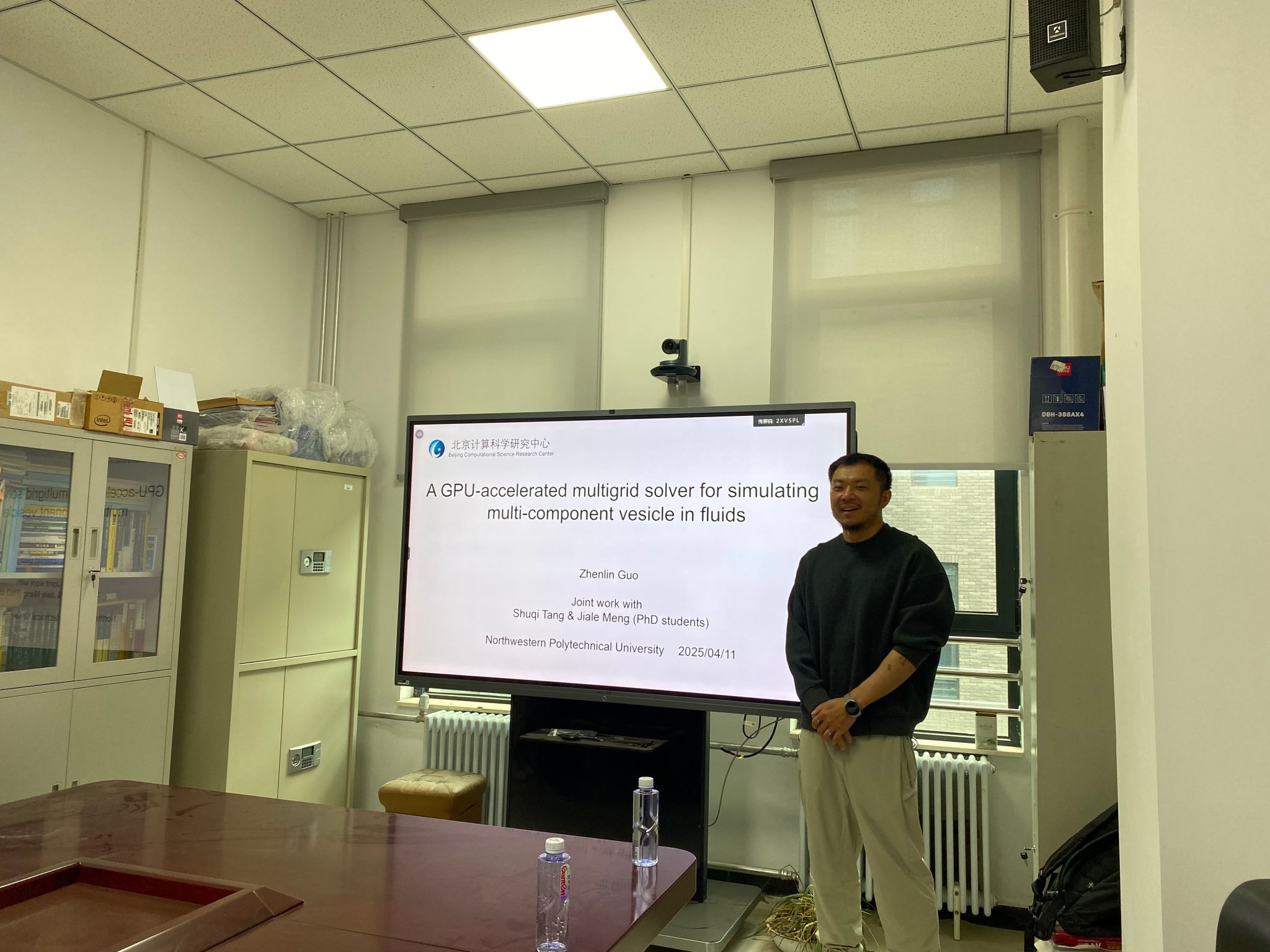 2025年4月11日,北京计算科学研究中心郭震林研究员受邀做客第26期九章学术讲堂,为我院师生作了题为《A GPU-accelerated multigrid solver forsimulating multi-component vesicle in fluids》的精彩学术报告。报告在长安校区海天苑大楼E201举行,教育实验学院/未来技术学院副院长蔡力教授、蜜桃直播 王振海副教授等近30名师生参加了报告会。报告会由荆菲菲副教授主持。