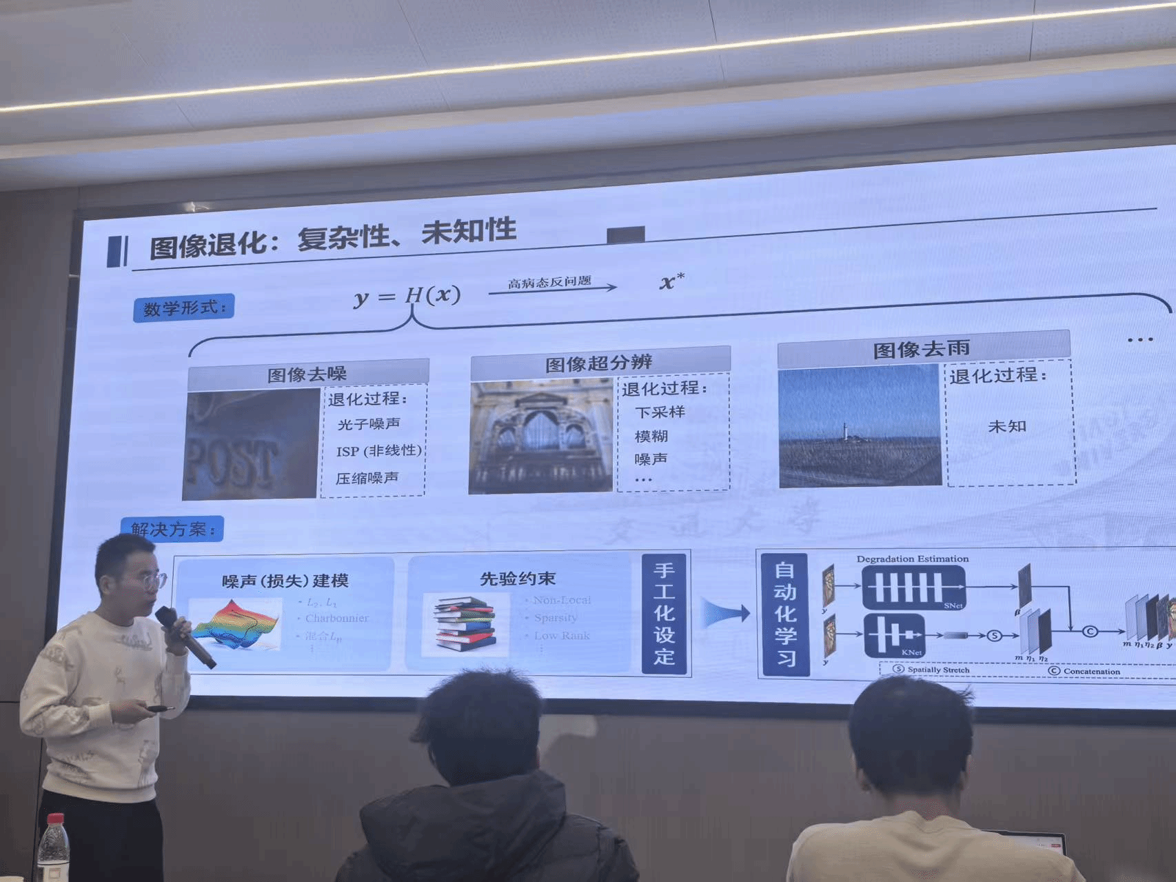 会议核心报告环节,四位专家学者带来了极具前沿性的学术分享。蜜桃直播 栗帅教授以“基于生成模型的真实图像超分”为题,深入探讨了语义信息引导、变分自编码迁移学习及强化学习在图像超分辨率问题中的创新应用,为解决真实场景下的图像退化难题提供了新思路;西安交通大学王仁振助理教授针对半监督学习的分布偏差问题,介绍了偏差自适应分类模型与异方差伪标签建模方法,有效提升了模型在复杂环境中的泛化性能与稳健性;西安交通大学岳宗胜教授聚焦图像复原的“自动化”与“通用化”建模,其研究成果已成功应用于华为旗舰手机影像系统,实现了技术落地与产业赋能;西安交通大学王海林博士分享了融合低秩平滑的高维数据恢复研究,提出的全新建模方法在图像视频处理、异常检测等多领域展现出优越性能。报告结束后,与会嘉宾围绕研究热点、技术难点展开深入研讨,形成了多项建设性共识。