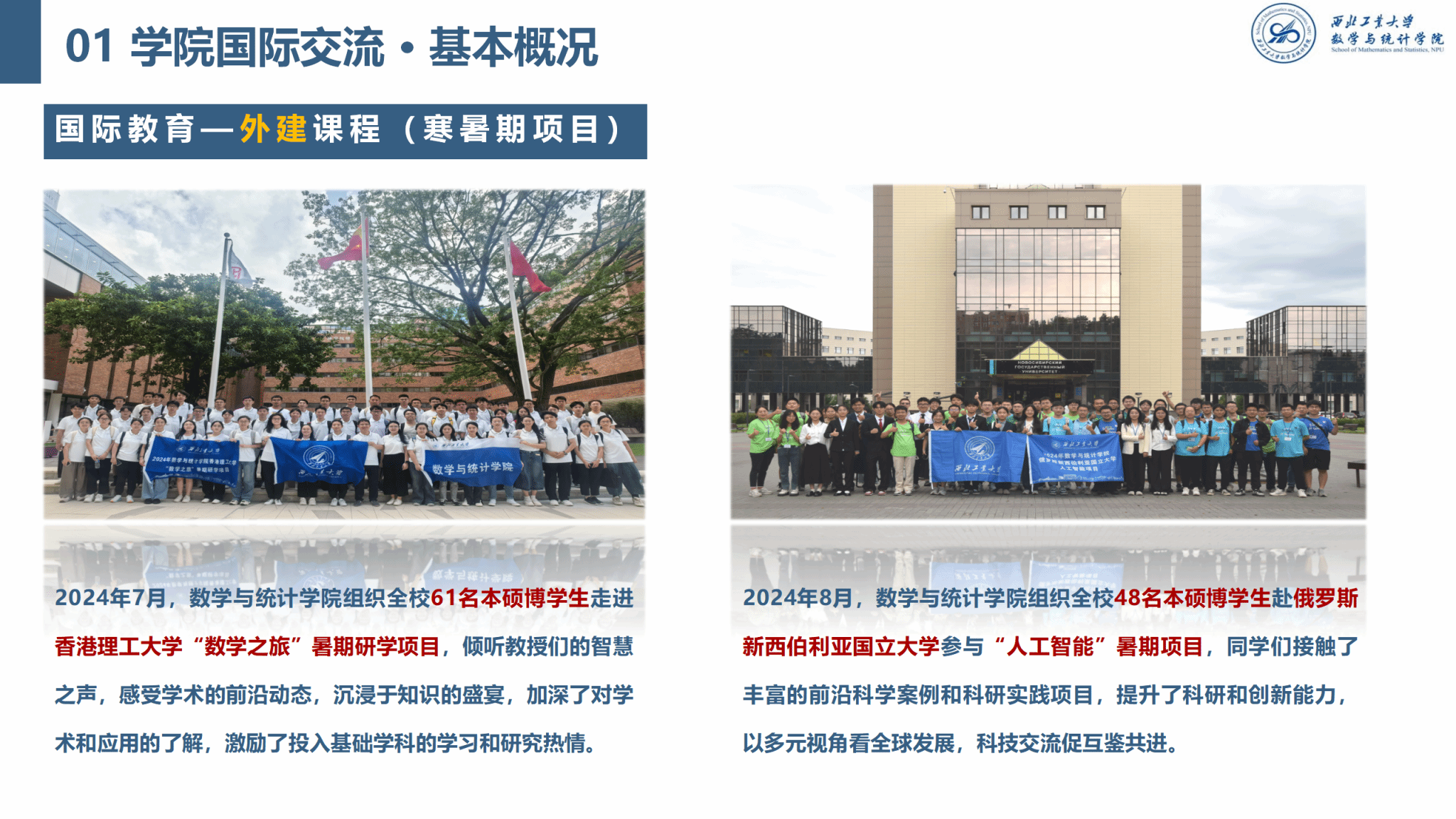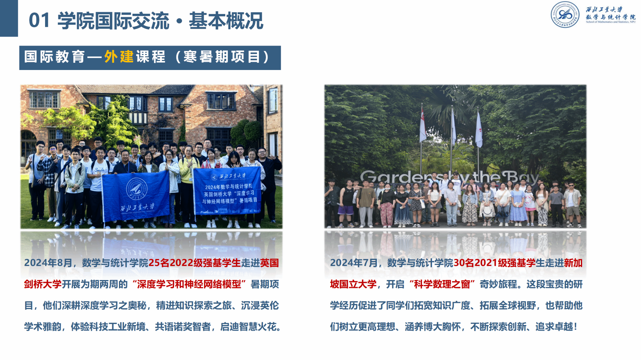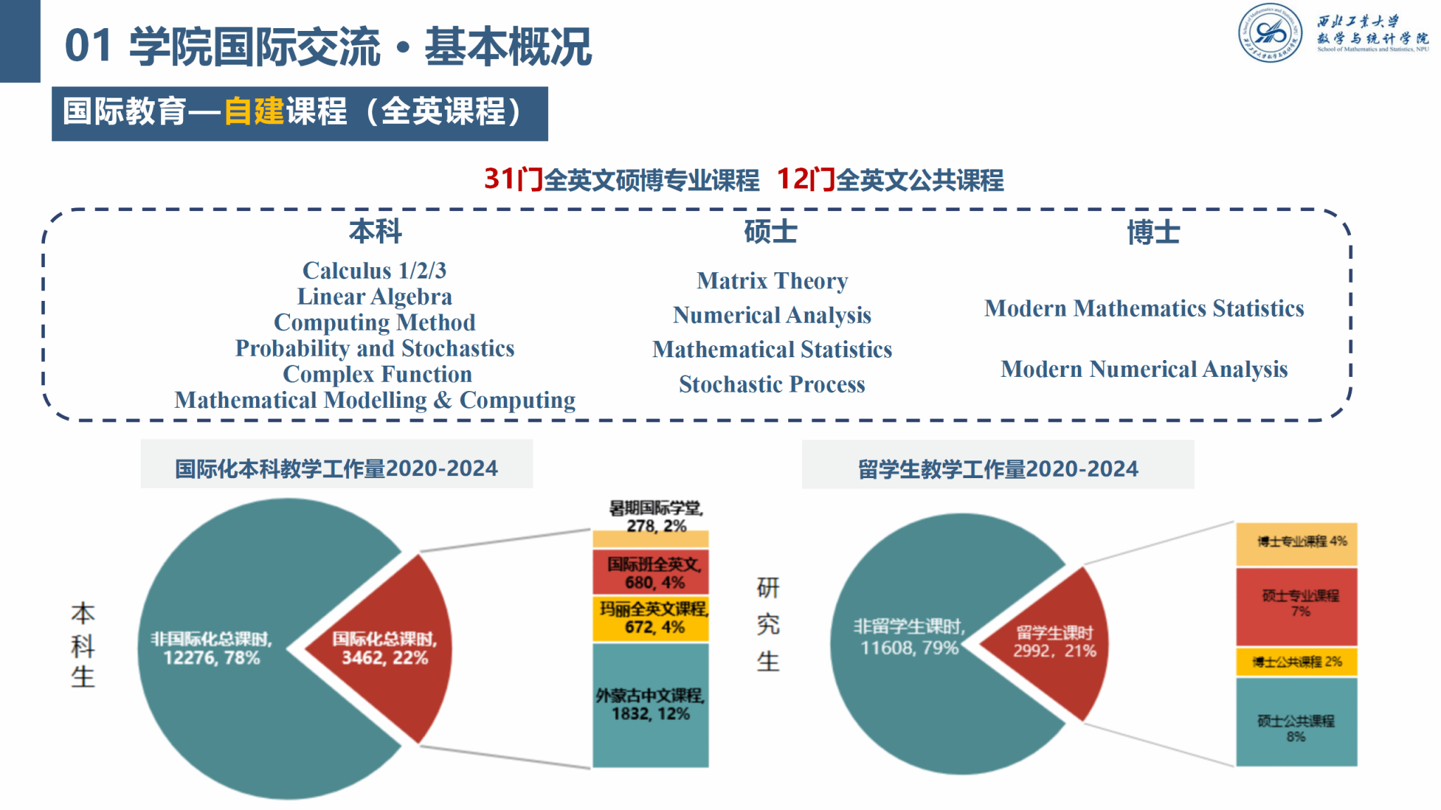 早在2011年我校启动“探索国际化人才培养模式”的国家级教育改革试点项目,创建中外学生同堂授课、同卷考试、同室科研、同班活动的本硕博贯通培养国际化人才本土教育模式的“国际班”。作为承担我校公共基础数学课程的蜜桃直播 ,相继开设了《微积分》、《线性代数》、《概率论与数理统计》、《复变函数与积分变换》、《计算方法》等5门英文课程。2016 年蜜桃直播 伦敦玛丽女王大学工程学院获教育部正式批准,成为我国西北地区一所中外合作办学机构,我院承担了该联合学院《微积分》、《线性代数》、《数学建模与计算》三门全英文课程的教学。