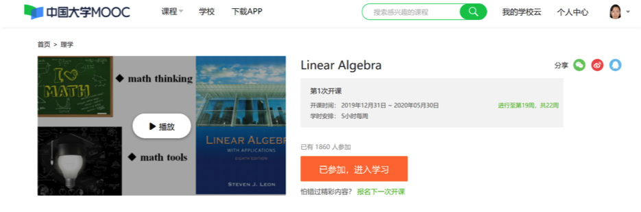 1.Linear Algebra(线性代数)国际爱课程平台课程链接,可进入课程介绍页,参加学习://www.icourse163.org/en/mooc/course/NPU1-1458030173