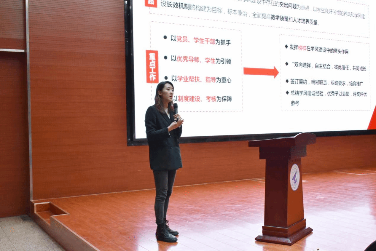 围绕如何加强学风建设,学院专业课教师代表于美、班主任代表王晓龙、宿舍导师团导师代表钮鹏程、本科生模范班级班长孔维骏和优秀学风宿舍舍长戴景文依次进行主题发言。
