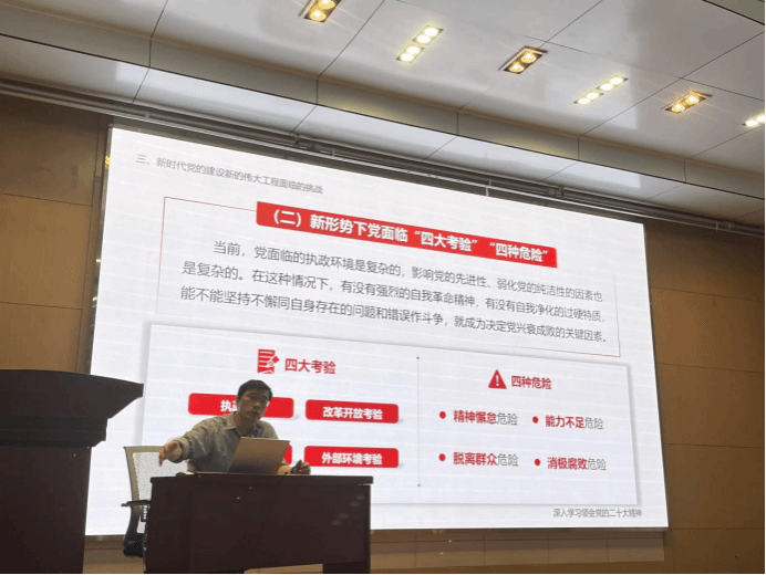 陈诚平老师从“深入学习领会党的二十大的重大意义”“新时代党的建设新的伟大工程取得的成就”“新时代党的建设新的伟大工程面临的挑战”“坚定不移全面从严治党,深入推进新时代党的建设新的伟大工程”四个方面向大家详细讲解了进入新时代以来我国全面从严治党以及坚持党的自我革命的重大理论和实践问题。陈诚平老师特别强调了“把党的建设作为一项伟大工程来推进,持之以恒推进全面从严治党”的重要性,并指导青年学生修身立德,坚定理想信念,从而实现人生价值。