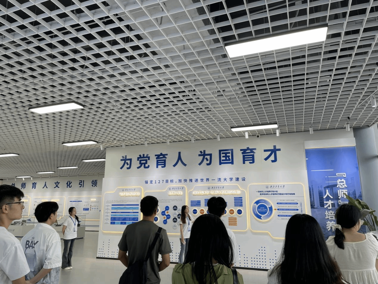 在讲解员的细致引导和讲解下,同学们先后参观了“总师”型人才培养、人才培养奖项展示、本科人才培养专项班、“做中悟”人才培养体系、本科教学质量保障体系和经典教材及教具展示六个板块内容,深入了解了我校特有的“低调务实、兼容并包,厚积薄发、为国铸剑”的“总师育人文化”,深刻体悟了我校“总师”型人才培养的历史、传承与创新过程,更全面领略了在奋力实现中华民族伟大复兴的新征程中西工大人所付出的磅礴伟力。