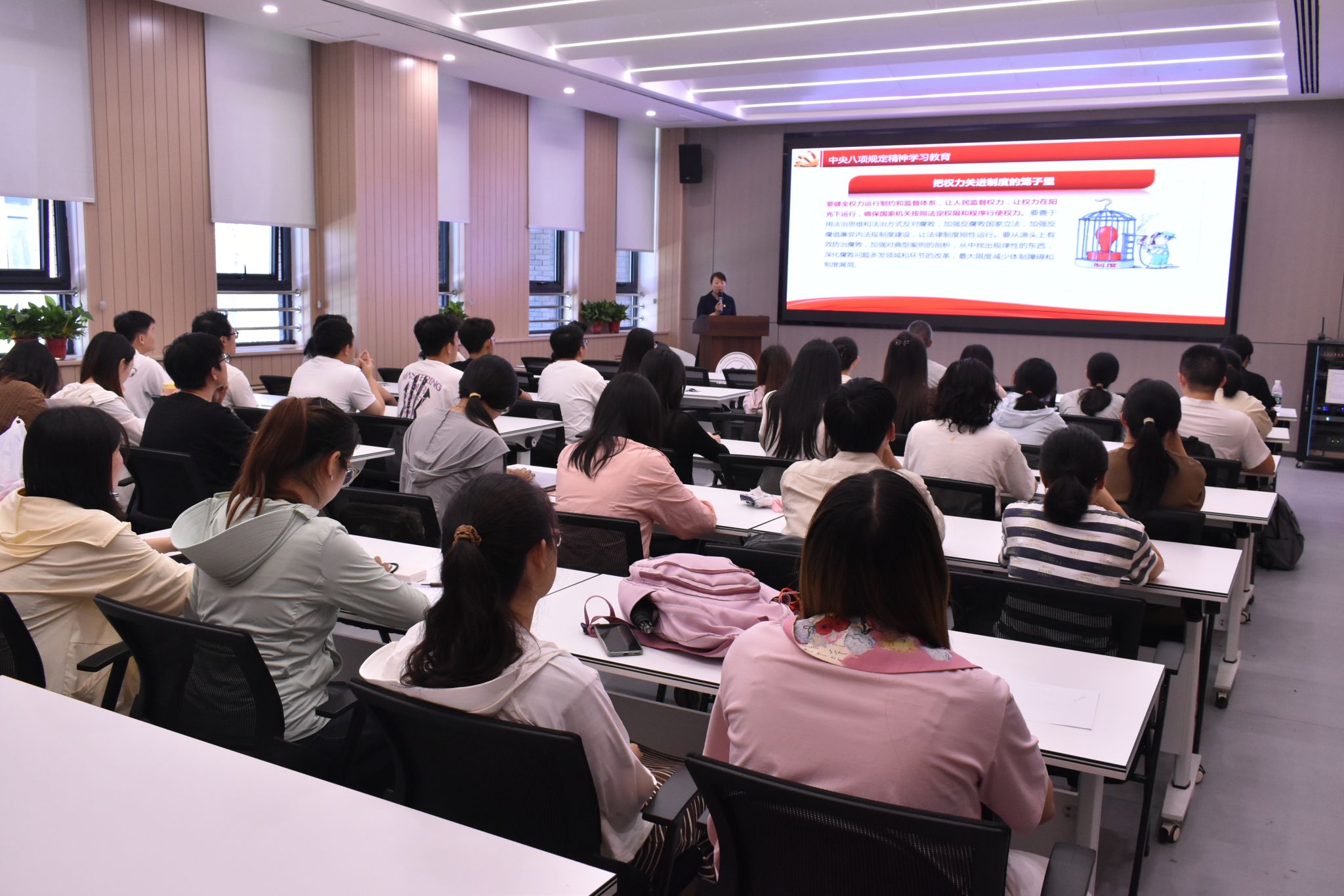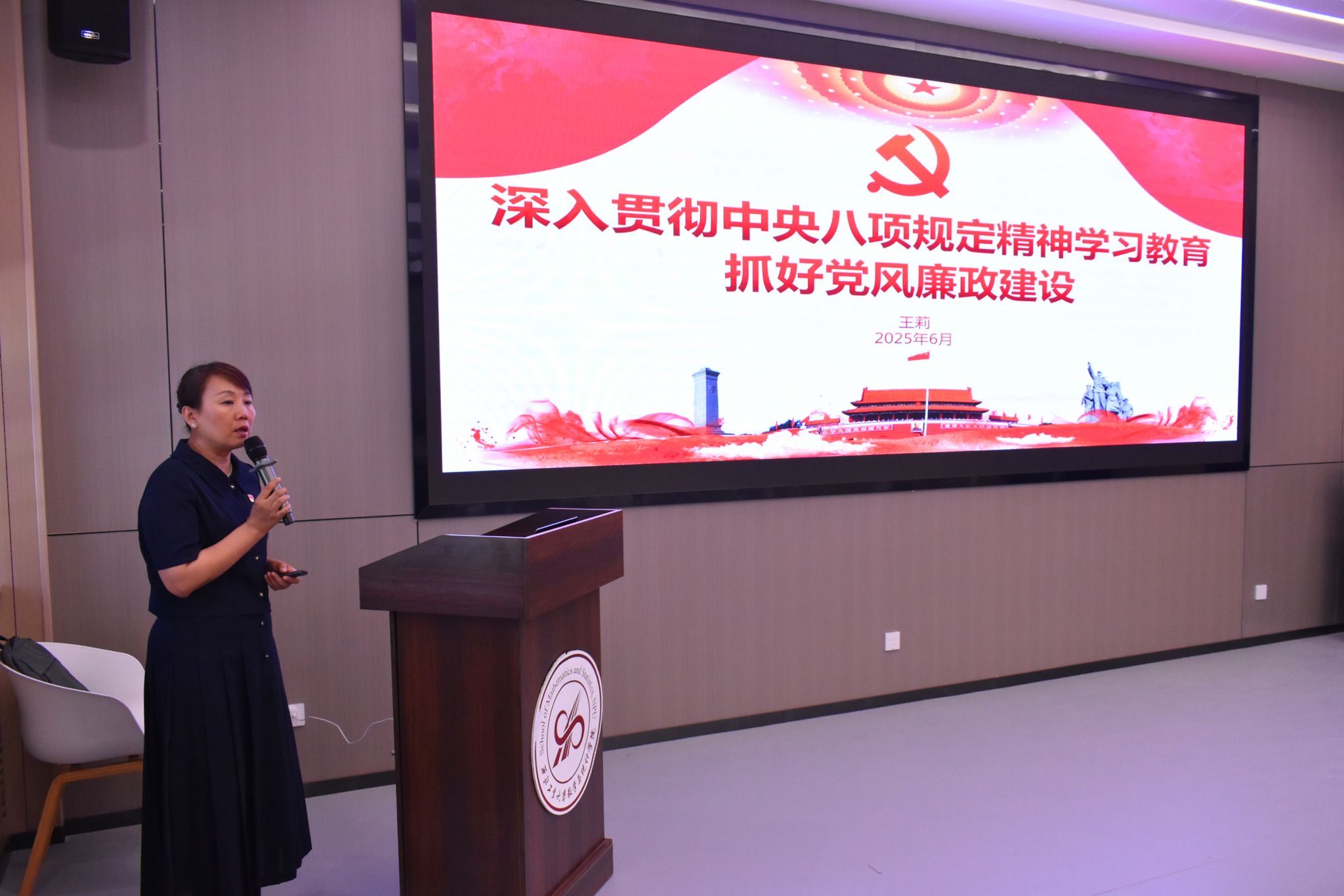 学院党委书记王莉以《深入贯彻中央八项规定精神学习教育,抓好党风廉政建设》为题,为全体同志带来党风廉政建设专题党课。她从中央八项规定精神的重大意义和内涵实质,习近平总书记的重要论述、重要讲话,警示教育案例等三个方面进行授课,逻辑缜密,条理清晰,案例深刻,列举数据详实,持续引导广大师生党员做到心有所畏、言有所戒、行有所止,形成护航学院事业高质量发展的强大力量。