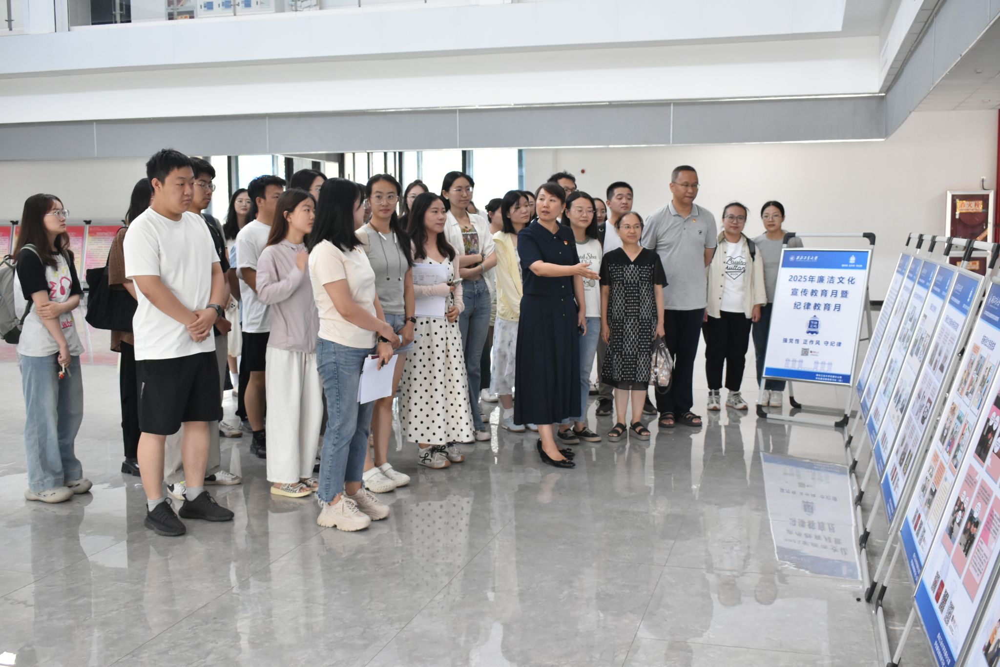 在学院海天苑大楼中厅,王莉带领同志们集体观看学习了学校纪委办公室汇编的2025年廉洁文化宣传教育月暨纪律教育月警示教育宣传展板,通过8幅“漫画说纪”和有关方面典型问题材料聚焦违规吃喝、违规收送礼品礼金等干部关注、师生关心的“四风”问题,重在警示教育党员干部和师生员工遵守党章党规党纪和有关法律,锲而不舍贯彻落实中央八项规定精神。