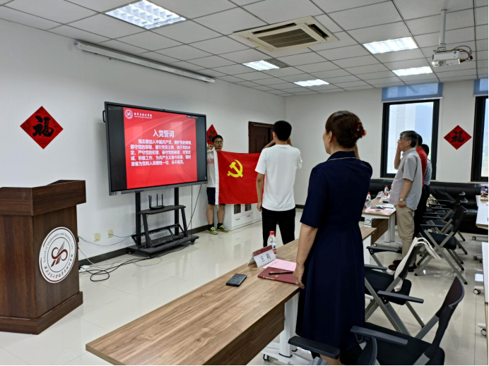 本科生师生融合党支部书记朱项项带领全体党员面向党旗重温入党誓词,回忆入党宣誓时的庄严承诺和奋斗决心,进一步激发党员政治热情,增强党员的光荣感、责任感和使命感。作为一名入党九年的青年教师朱项项说,入党是政治生命的开始,一定要珍惜自己的政治生命,要对得起组织的培养、领导的信任,努力工作,奉献国家。