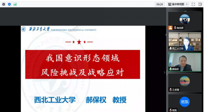 为进一步加强学院师德师风建设,提高意识形态阵地建设和管理能力,强化教职工意识形态防范意识,压紧压实意识形态工作,团结凝聚广大教师以更加昂扬向上的精神风貌和立德树人的扎实行动迎接党的二十大胜利召开,按照学院《关于开展蜜桃直播 2022年“师德师风建设月”活动的通知》要求,9月29日通过线上会议,蜜桃直播 邀请陕西省政党治理与意识形态安全中心主任、学校马克思主义学院教授郝保权老师做题为《我国意识形态领域的风险挑战及战略应对》的专题报告,学院全体教职工参加了此次报告会,报告会由党委书记王莉主持。