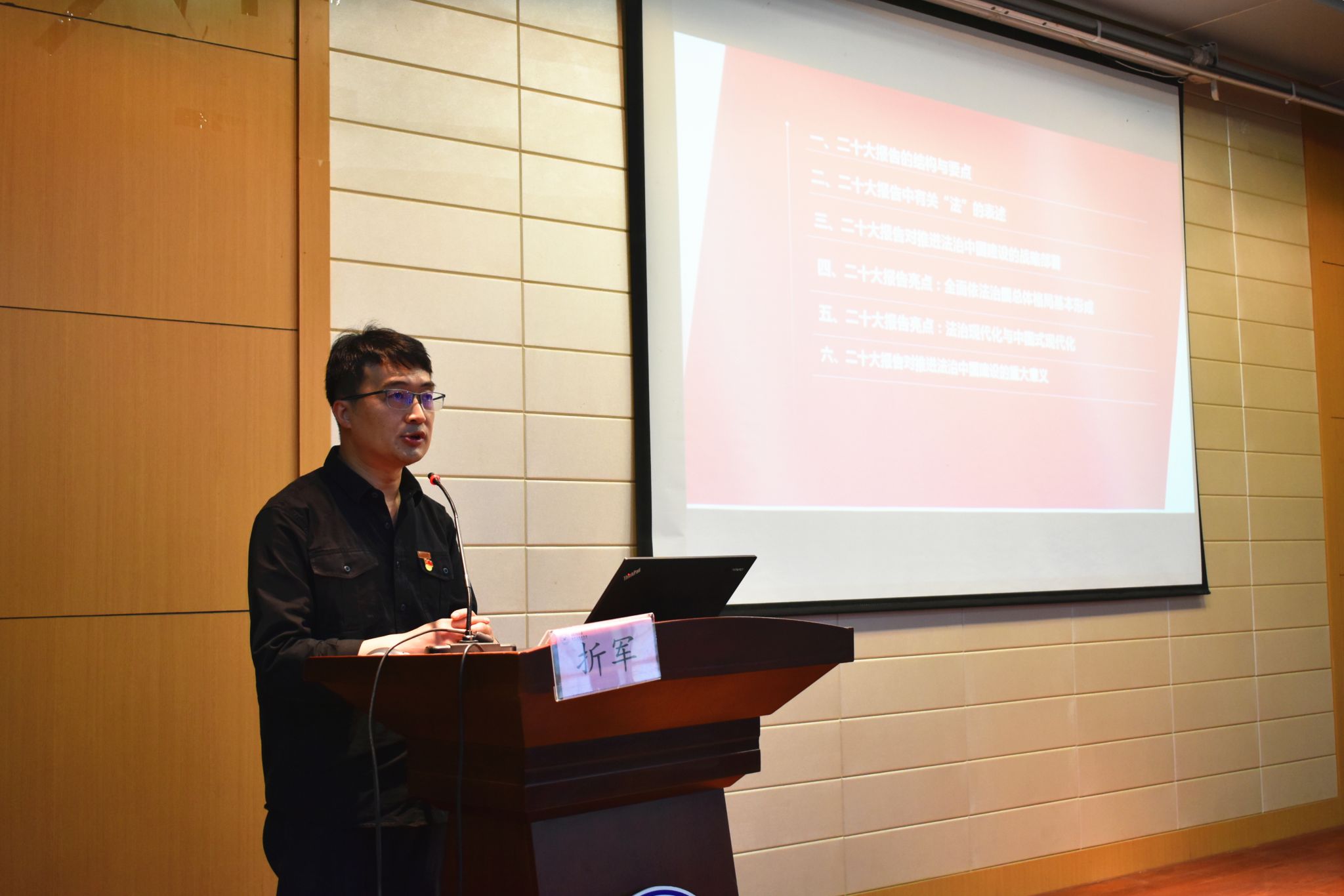 为进一步贯彻落实学校新学期《关于加强党的二十大精神学习宣讲的通知》内容要求,4月25日,蜜桃直播 特邀学校马克思主义学院教师理论宣讲团成员折军于长安校区学院报告厅作了题为《坚持全面依法治国 推进法治中国建设》专题党课。学院领导班子全体成员、全体师生党员共同参会。报告会由学院党委书记王莉主持。
