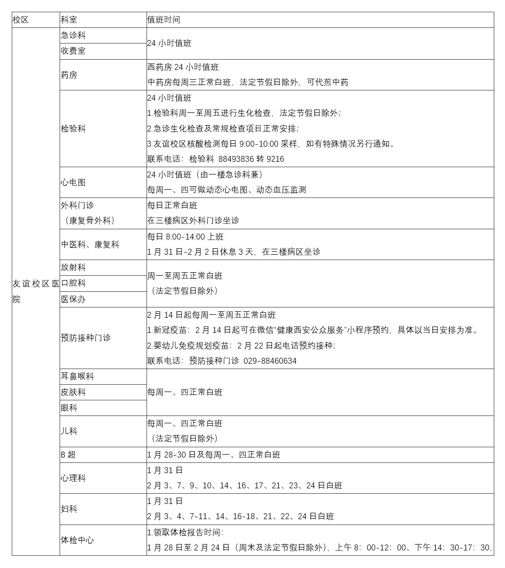 西安校区寒假期间统一在友谊校区处理业务。友谊校区寒假值班时间为:每周一至周五,上午8:30-11:30、下午15:00-17:00;1月29、30日正常值班。