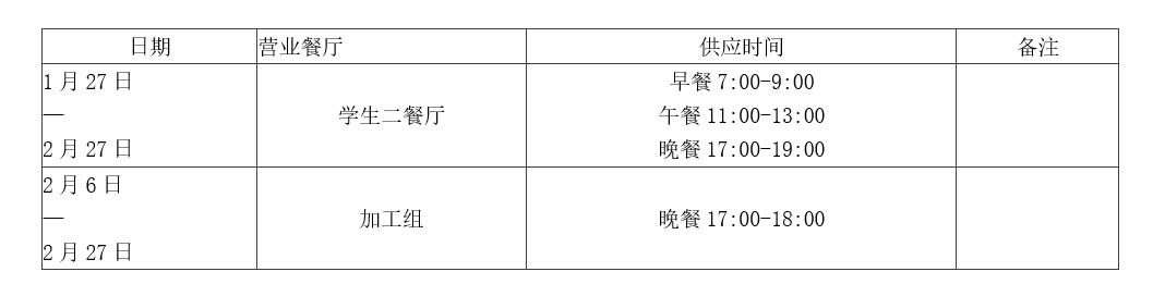 友谊校区学生一餐厅、美食广场、风味小吃城、教工餐厅和民族餐厅2月26日午餐起正常供应;幸福小厨及公诚快餐(含饼屋)2月27日午餐起正常供应。