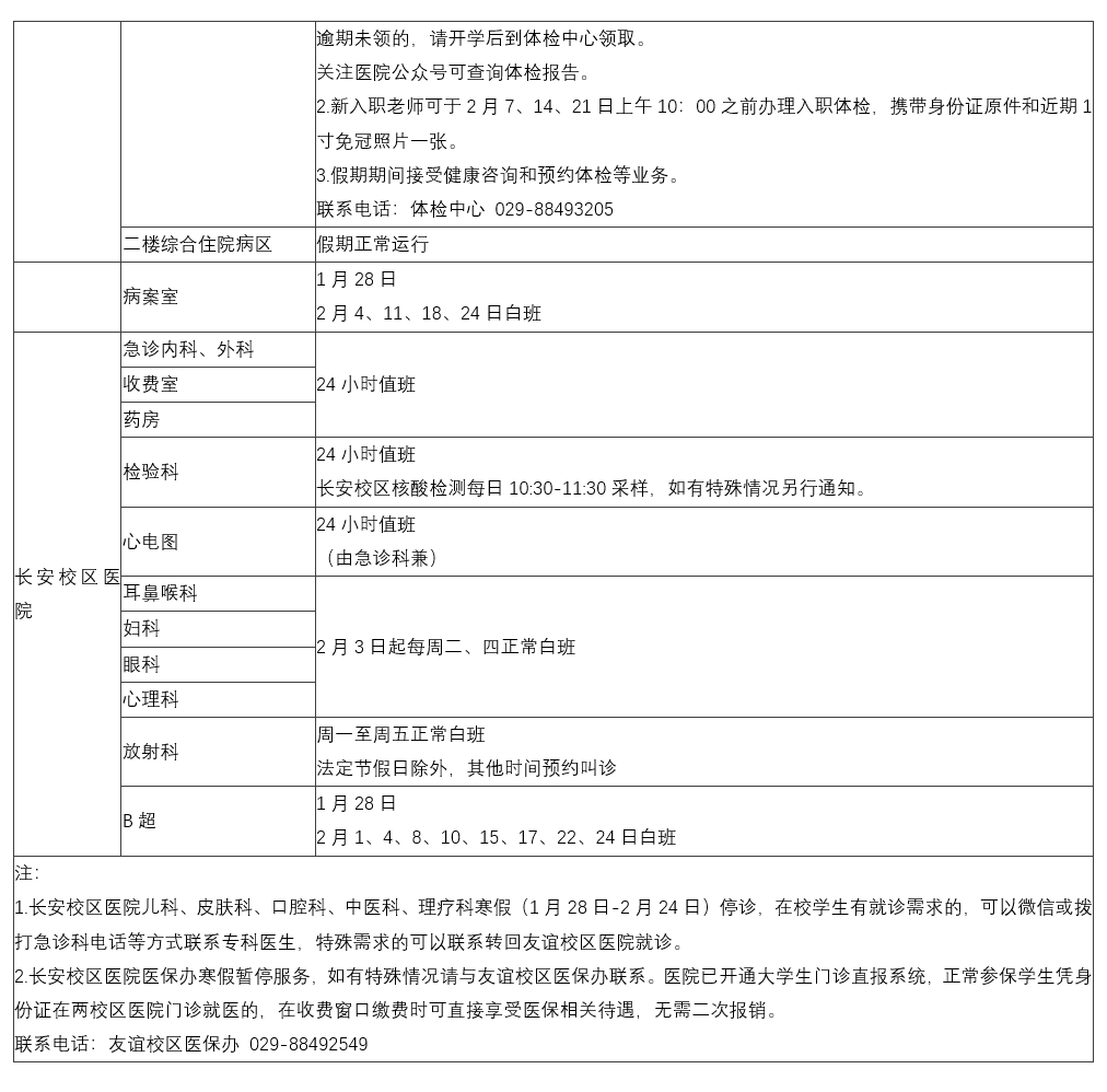 友谊校区1月27日——2月22日、长安校区1月28日——2月22日进入寒假运行状态。