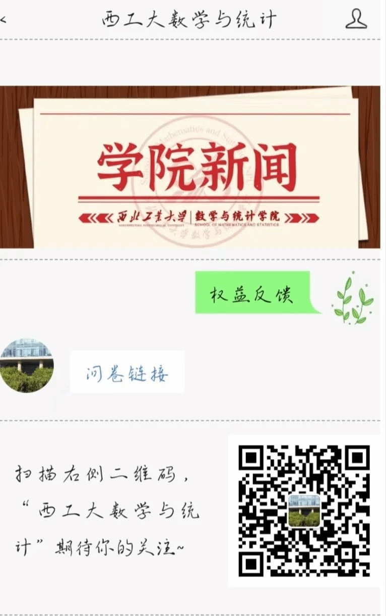 2.在“西工大数学与统计”微信公众号内回复“权益反馈”,即可获取权益问卷链接。同时学院小树苗动态也会定期发送问卷链接,大家可以在问卷里对自己的权益问题进行反馈,NPU小树苗QQ号:2446167785。