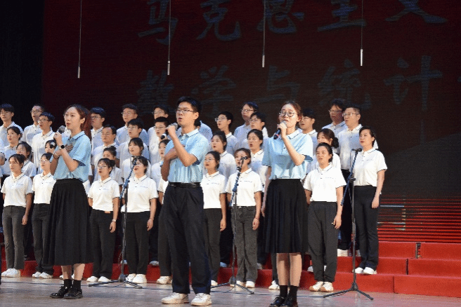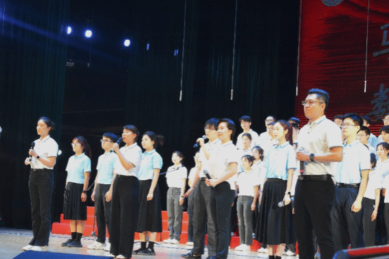 尾声副歌部分迎来情感巅峰,蜜桃直播 党委书记王莉、党委副书记张莹、马克思主义学院副院长贺苗、党委副书记耿云辉共同登台,以铿锵如金石、深情似涓流的朗诵融入合唱声浪。四位老师饱含深情的朗诵,深情礼赞了平凡奋斗者汇聚的磅礴伟力,极大地鼓舞了在场师生。