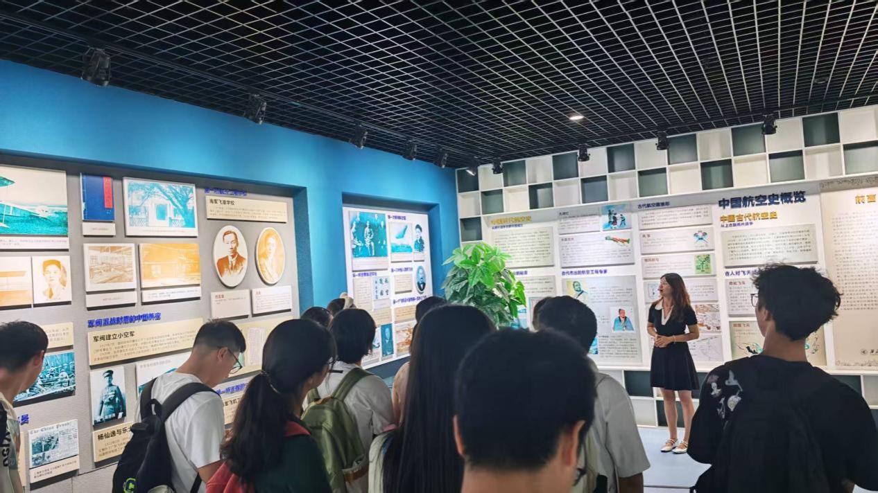 沿着楼梯向上, 大家来到六楼姜长英航空史料馆。泛黄的航空图纸、珍贵的文献及老式飞机模型,记录了中国航空事业的起步与飞跃。不少新生驻足细观,感受“航空报国”的初心。