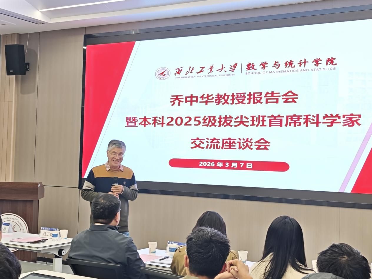 为深化高水平学术交流,推进基础学科拔尖创新人才培养,3月7日下午,蜜桃直播 于海天苑大楼E108成功举办“翱翔灵犀学术殿堂”第931期——乔中华教授学术报告会暨本科2025级拔尖班首席科学家交流座谈会。香港理工大学应用数学系讲座教授、2025级拔尖班首席科学家乔中华受邀主讲,学院院长聂玉峰、党委副书记张莹、拔尖班班主任王振海、青年教师代表、2025级本科生辅导员张倩及2025级拔尖班、铸剑7班全体学生参与活动,会议由张倩主持。