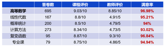 通过四周的课程教学,通过与学生的交流、学院的公共课教学调查,以及对自己班级的问卷调查,收集到了学生对本课程在线教学各方面的反馈、意见和建议。在第一周教学结束后,蜜桃直播 所开设的本科公共课中,高等数学课程在整体评价/教师评价/满意度均居各门课程第一,说明了课程的构建和组织符合在线教学的实际,受到了学生的认可。