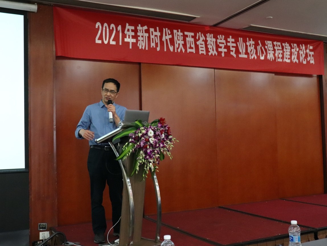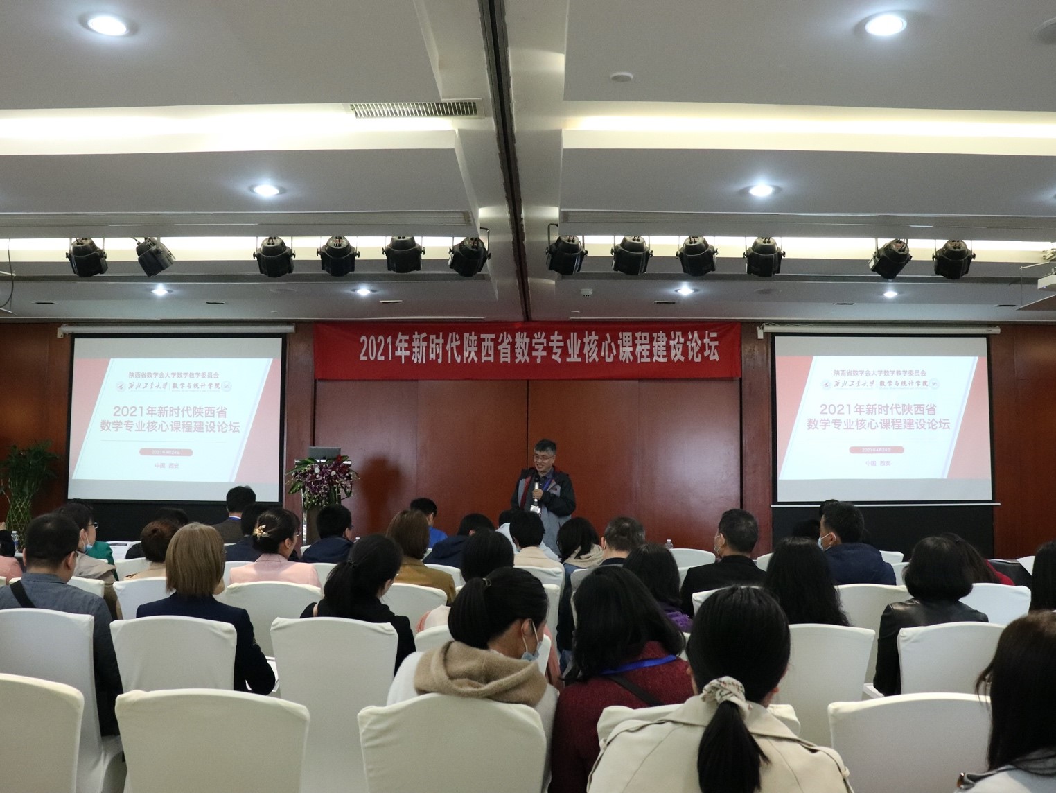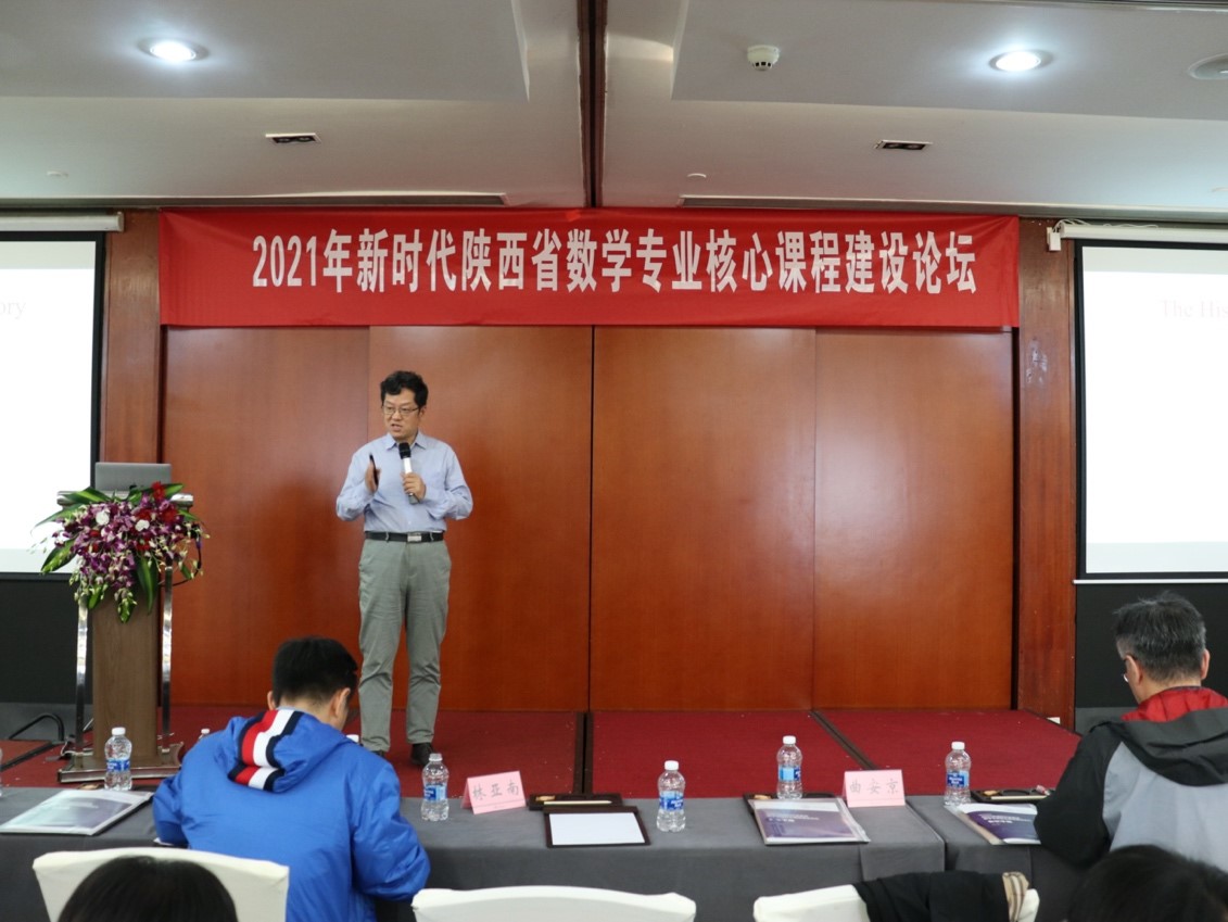 由陕西省大学数学教学委员会主办,蜜桃直播 承办的新时代陕西省数学专业核心课程建设论坛,于2021年4月24日下午在西安市高新区志诚丽柏酒店20楼多功能厅召开。本次论坛旨在加强陕西地区数学专业核心课程建设、促进陕西高等院校数学核心课程教师之间的交流。会议邀请了厦门大学林亚南教授、中国科技大学赵卿教授、西北大学曲安京教授进行报告。来自西安、宝鸡、杨凌、兰州、银川等地的26所高校130余位高校数学课程负责人及教师参加了本次论坛。
