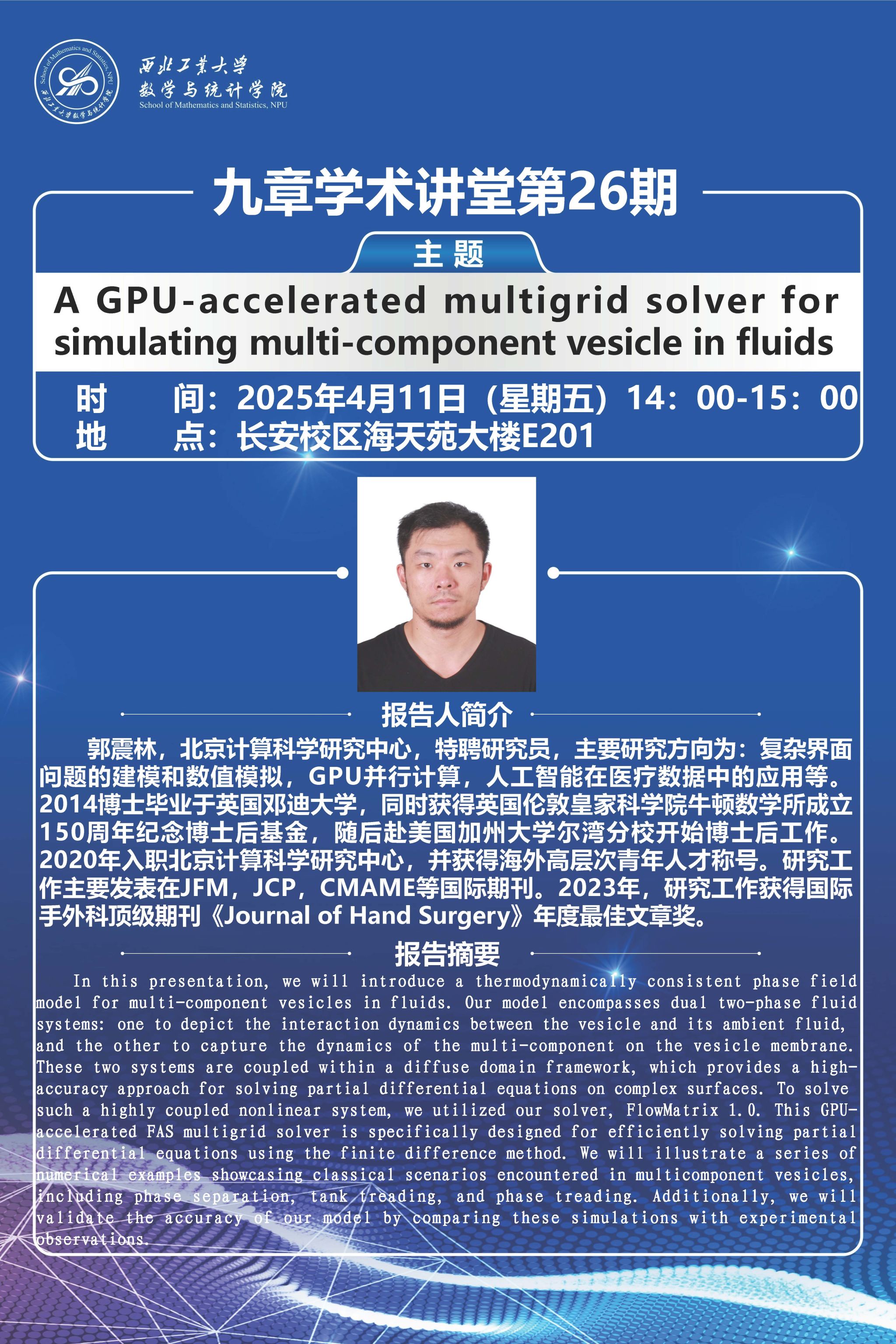 2025年4月11日,北京计算科学研究中心郭震林研究员受邀做客第26期九章学术讲堂,为我院师生作了题为《A GPU-accelerated multigrid solver forsimulating multi-component vesicle in fluids》的精彩学术报告。报告在长安校区海天苑大楼E201举行,教育实验学院/未来技术学院副院长蔡力教授、蜜桃直播 王振海副教授等近30名师生参加了报告会。报告会由荆菲菲副教授主持。