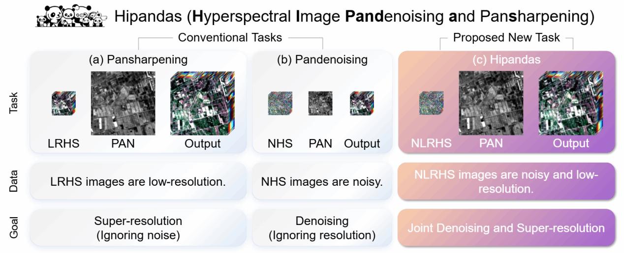 论文介绍:高光谱图像(HSIs)常因成像设备限制而存在噪声且分辨率较低。近期发射的卫星可同步采集高光谱图像与全色(PAN)图像,因此可以通过融合全色图像实现去噪与超分辨率重建,从而生成洁净的高分辨率图像。然而既有研究将这两个任务视为独立过程,导致误差累积。本文提出高光谱图像全色联合去噪与锐化方法(Hipandas),可从含噪低分辨率高光谱图像(LRHS)和高分辨率全色图像重建高分辨率高光谱图像(HRHS)。