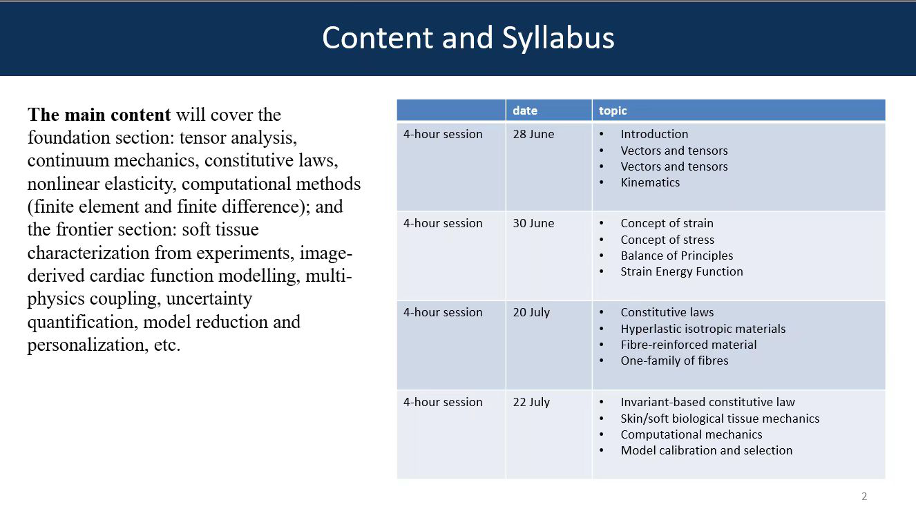 心脏力学是利用力学的原理及方法研究心脏活动特征、变化规律以及评估心脏泵功能的学科。本课程重点介绍了张量计算及其在非线性弹性力学中的应用。然后,将以心肌材料为重点,对各种本构模型进行介绍。最后,介绍了如何用有限元软件FEniCS求解非线性弹性力学问题。