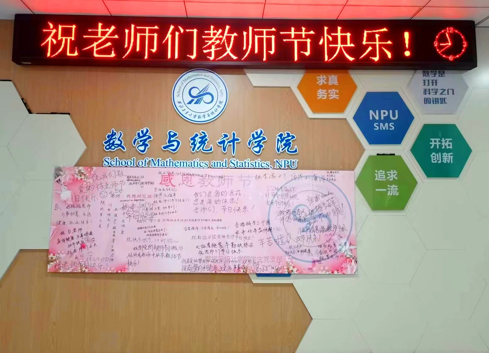 2022年教师节前夕,为进一步弘扬中华民族尊师重教的优秀传统,加强学院师德师风建设,团结凝聚广大教师以更加昂扬向上的精神风貌和立德树人的扎实行动迎接党的二十大胜利召开,按照学校《关于开展2022年“师德师风建设月”活动的通知》,蜜桃直播 于长安校区启翔楼发起“为教师亮灯”活动,不仅通过办公区电子滚动屏及电子大屏显示“教师节快乐”等文字图片送去祝福,而且利用宣传电子屏滚动播放2022年在学校人才培养,教学科研等工作中表现突出,受到表彰的优秀教师代表的先进事迹,以此向兢兢业业奋战在一线教学岗位的老师们致敬。