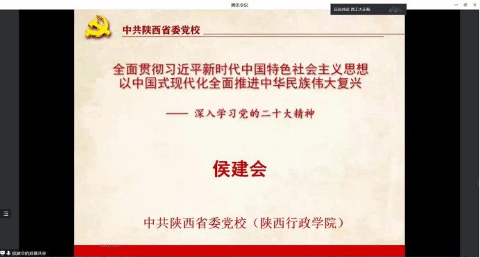 12月1日,蜜桃直播 邀请中共陕西省委党校(陕西行政学院)侯建会教授作党的二十大精神专题辅导报告。辅导报告通过线上视频的方式开展,学院党委书记王莉主持,学院领导班子成员、教职工党员、学生党员代表共计100余人参加本次报告会。