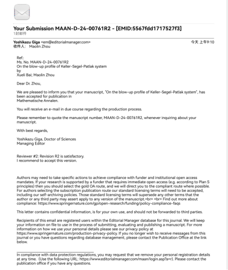 近日,蜜桃直播 分析与几何研究团队青年教师白学利教授与南开大学周茂林教授合作,在Keller-Segel-Patlak模型的解的爆破形状精确刻画方面取得突破,研究结果“On the blow-up profile of Keller-Segel-Patlak system”被数学综合期刊Mathematische Annalen接收,这是我校继姚磊教授之后再次在该著名数学综合期刊发文。