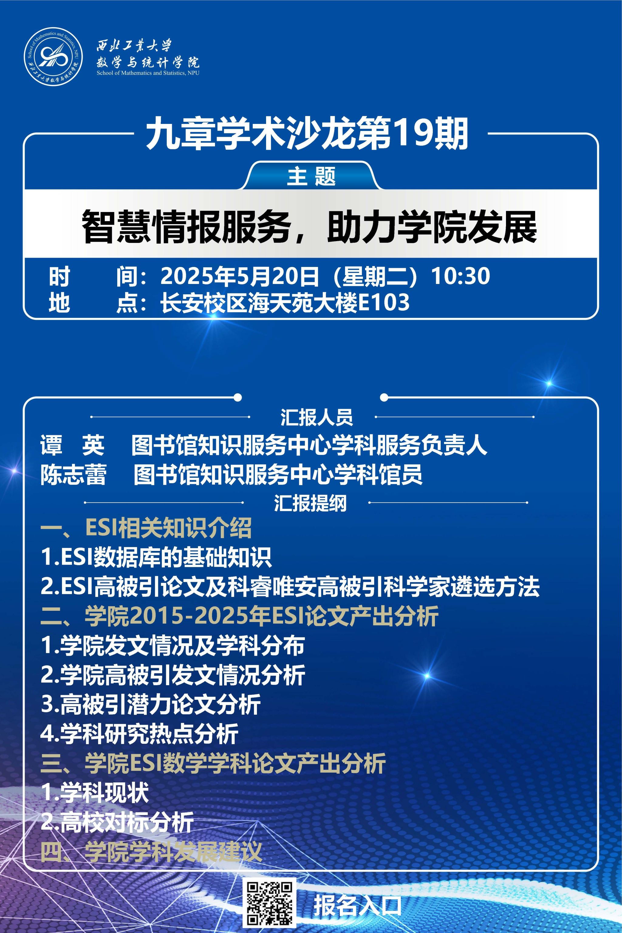 随后,图书馆知识服务中心学科服务负责人谭英围绕ESI基础知识、ESI高被引论文和热点论文、科睿唯安“高被引科学家”三方面进行了细致介绍。图书馆知识服务中心学科馆员陈志蕾对学院近十年论文产出及ESI数学学科论文产出进行了详细分析,并依此提出学院学科发展的相关建议。