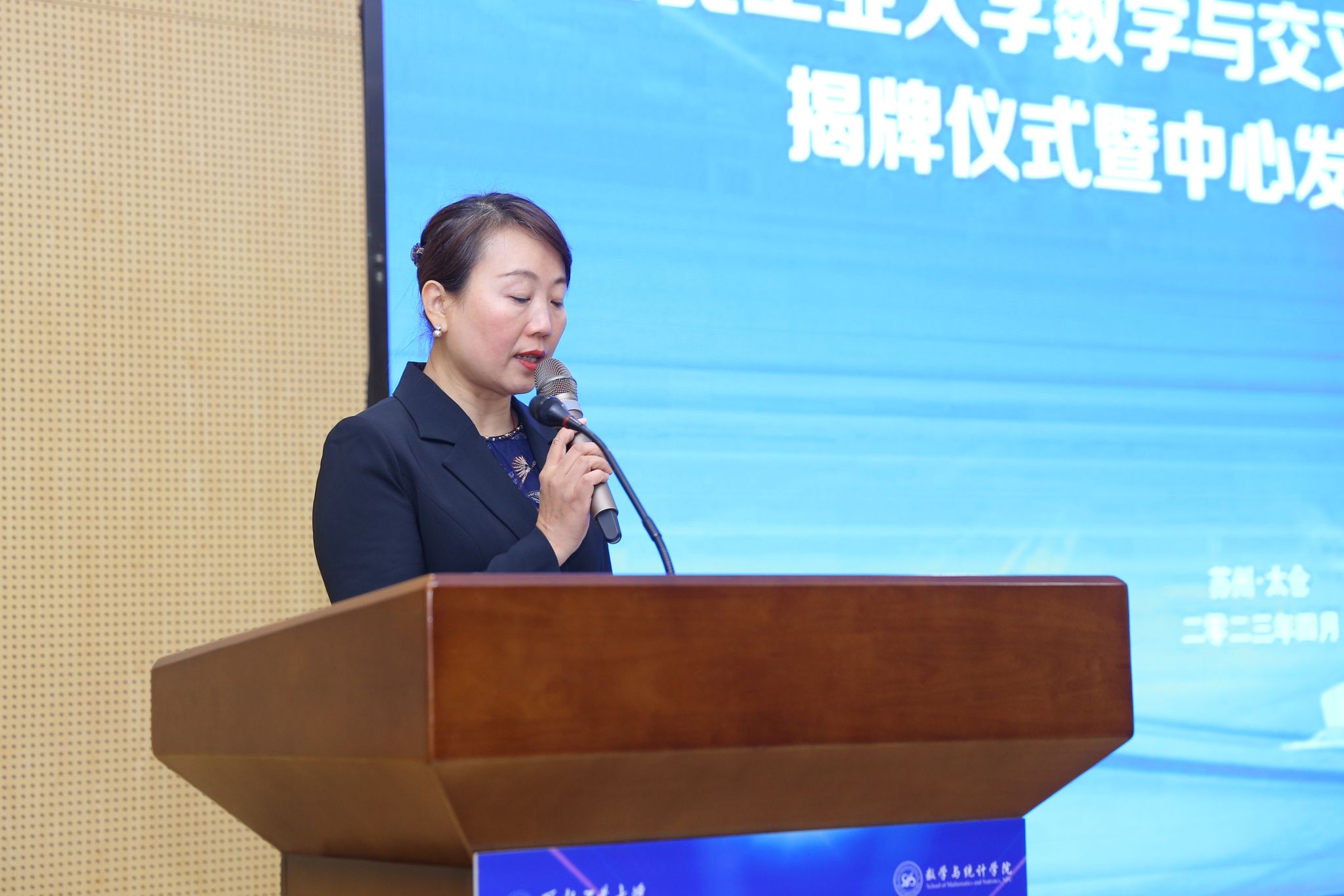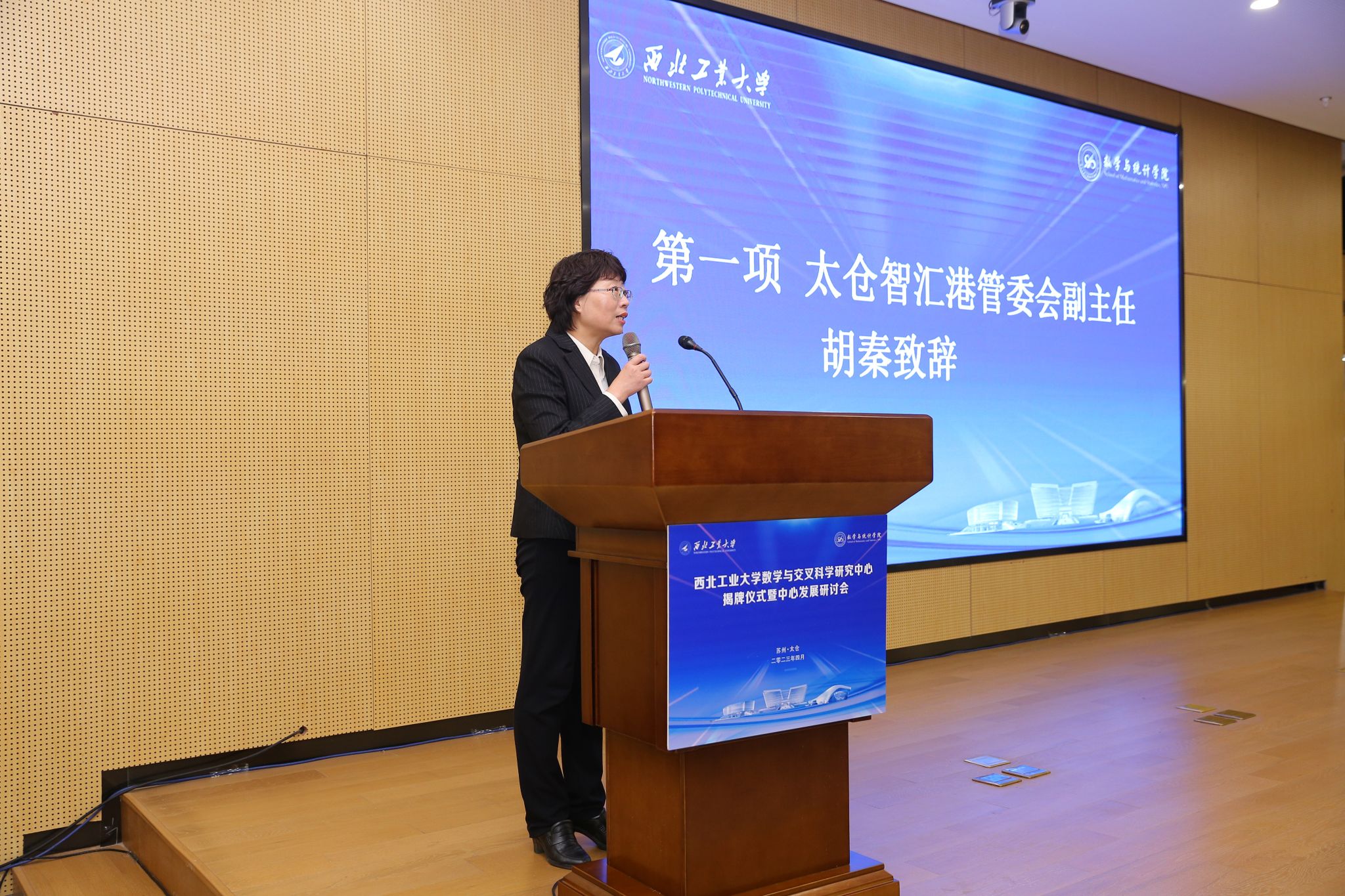 会上,太仓智汇港管委会副主任胡秦首先致辞。她说,数学与交叉科学研究中心今天在太仓智汇港正式成立,相信它必将成为学院有效培养优秀青年教师、有效引进潜力大的高水平人才、有效开展对外合作联合攻关的创新平台,为我校数学学科早日进入国内一流、国际知名数学学科行列奠定基础。