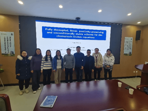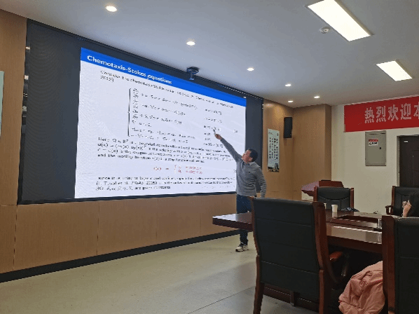 王坤老师首先介绍了趋化性Stokes模型的生物背景。为了高效地数值求解该模型,并保持氧气浓度、物质密度等的物理性质,他及合作者利用正则化技术、通量校正的有限元方法等设计了一种全解耦的、线性的保正数值算法。随后,王坤老师详细地介绍了算法的无条件稳定性和误差估计的结果,并通过数值例子再现了真实的物理过程。报告的最后,王坤老师又介绍了近阶段的研究工作。