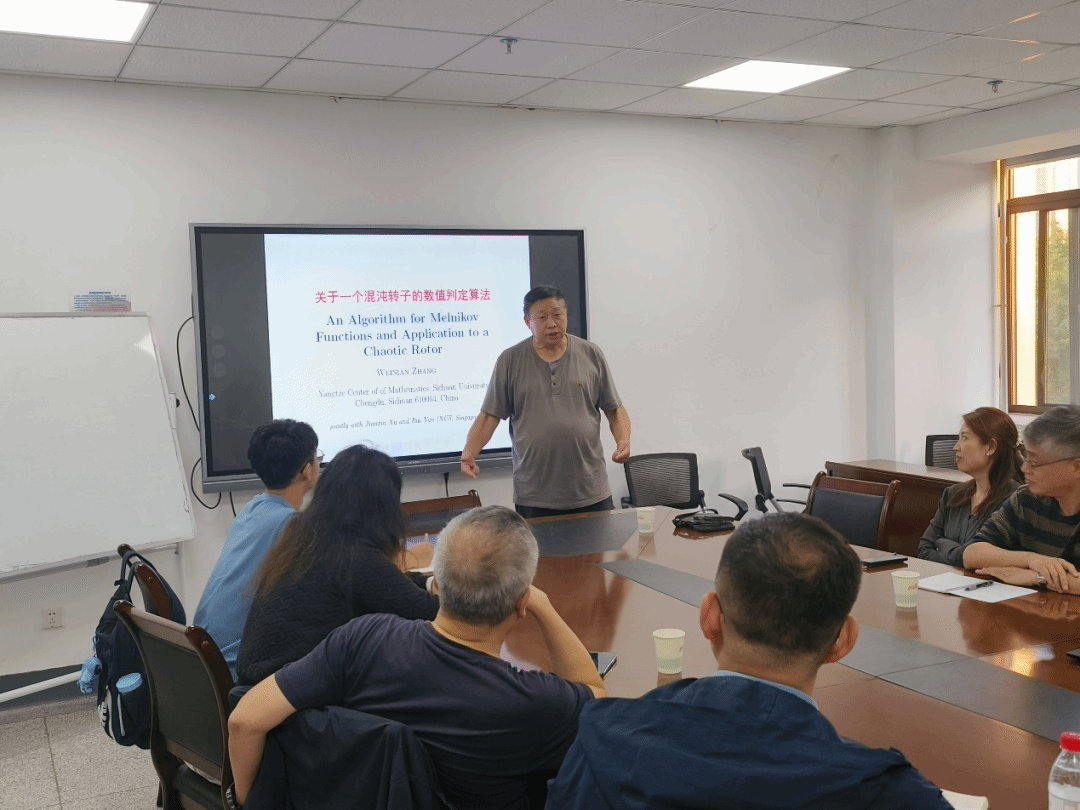 2023年10月31日,第二期“九章数学学术讲堂”在勇字楼701会议室进行,讲堂邀请四川大学张伟年教授作题为“一个混沌转子的数值判定算法”的学术报告。蜜桃直播 院长聂玉峰、副院长都琳,以及徐伟、许勇教授等20余位师生参会,报告由许勇主持。