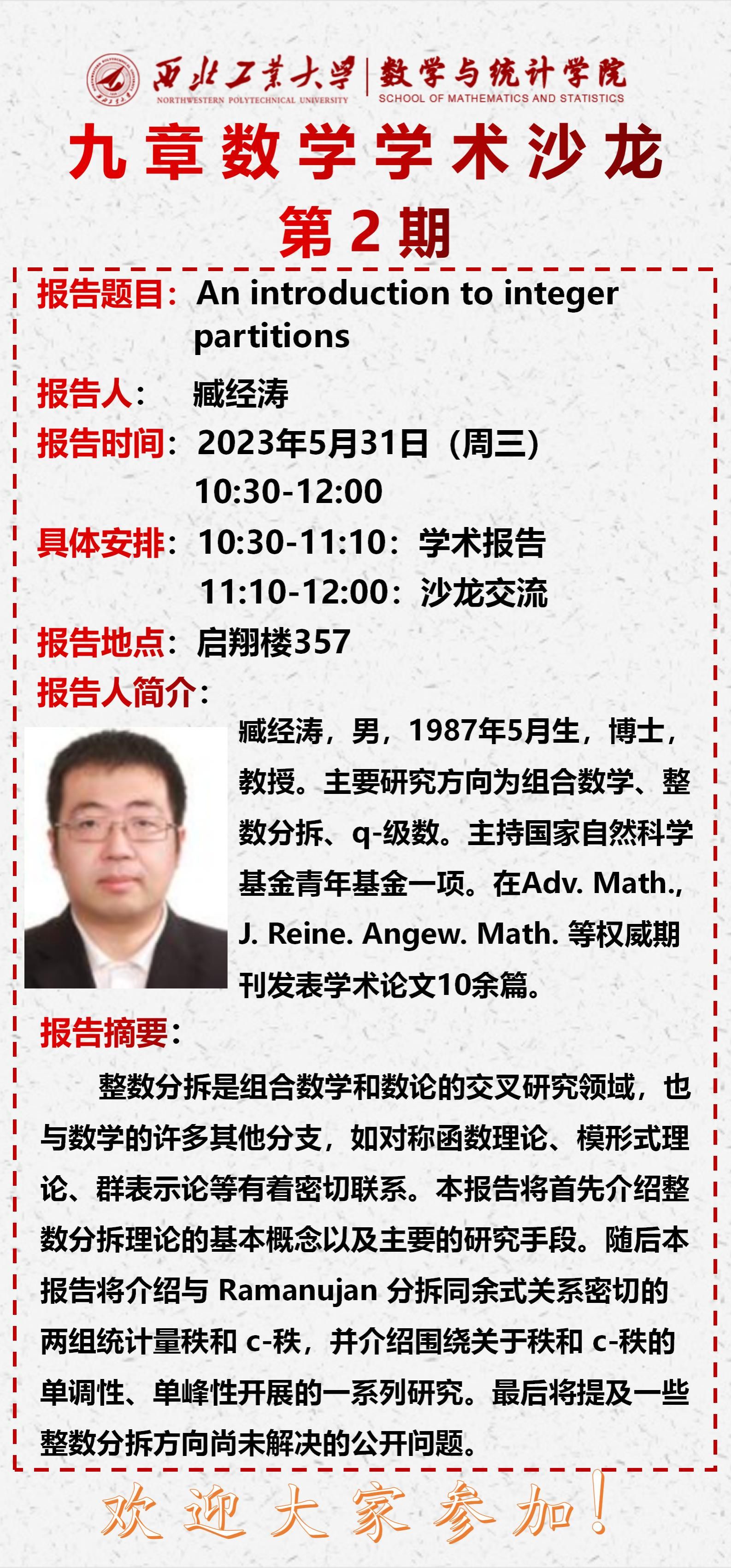 2023年5月31日,蜜桃直播 第二期“九章数学学术沙龙”在启翔楼357举行。蜜桃直播 臧经涛教授做了题目为《An introduction to integer partitions》的报告,都琳副院长、钮鹏程教授、陆由教授、以及学院20余位教师和学生参加,会议由二级学科负责人白延东副教授主持。