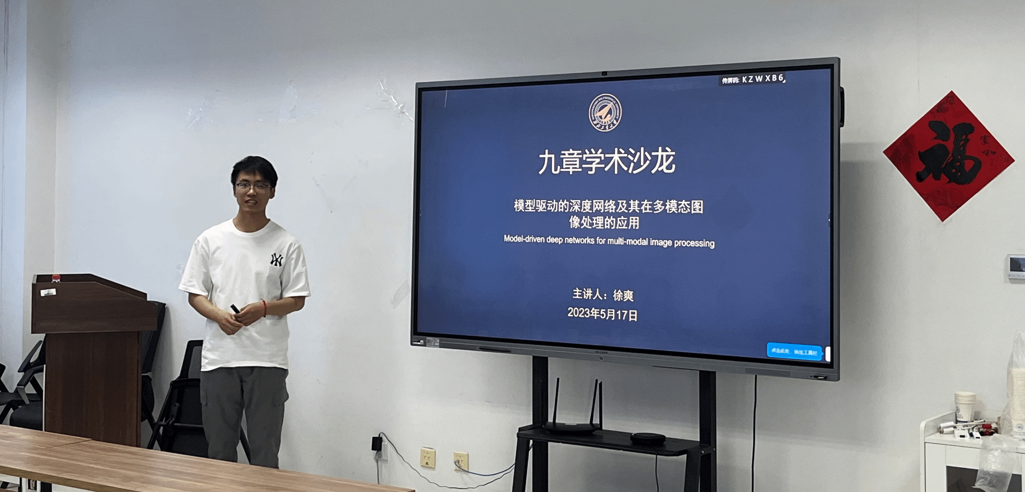 首先,聂玉峰表示,举办学术沙龙是促进师生间学术交流与沟通的有效渠道,通过科研工作的交流分享,不仅助力学科交叉融合,更加有利于碰撞新思路、开辟新方向。他鼓励学生多参与学术会议,尽早接触与了解科研工作,提前为就业谋划布局。接下来,徐爽老师做了题目为《模型驱动的深度网络及其在多模态图像处理的应用》的报告。徐爽分别从多模态图像处理的数学模型、模型驱动的深度学习、应用和总结四个部分详细介绍了本人的研究内容,并与参会师生进行了深入热烈的讨论。