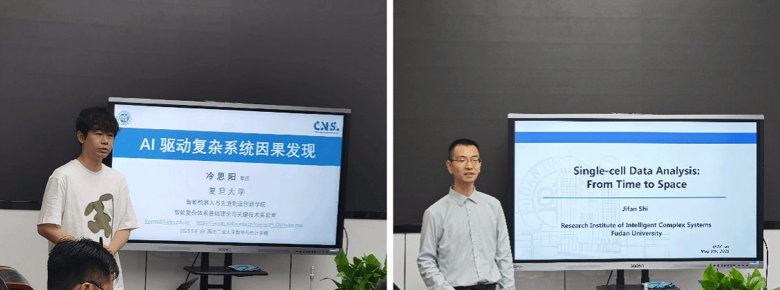 2025年5月8日,蜜桃直播 第28、29期“九章学术讲堂”成功举办。讲堂邀请复旦大学智能机器人与先进制造创新学院冷思阳教授和复旦大学智能复杂体系基础理论与关键技术实验室史际帆副研究员,分别作题为“迁移学习下单细胞空间位置推断”和“AI驱动复杂系统因果发现”的报告,并与我院教师围绕科研合作进行座谈。学院20余位师生参会,报告由裴斌教授主持。