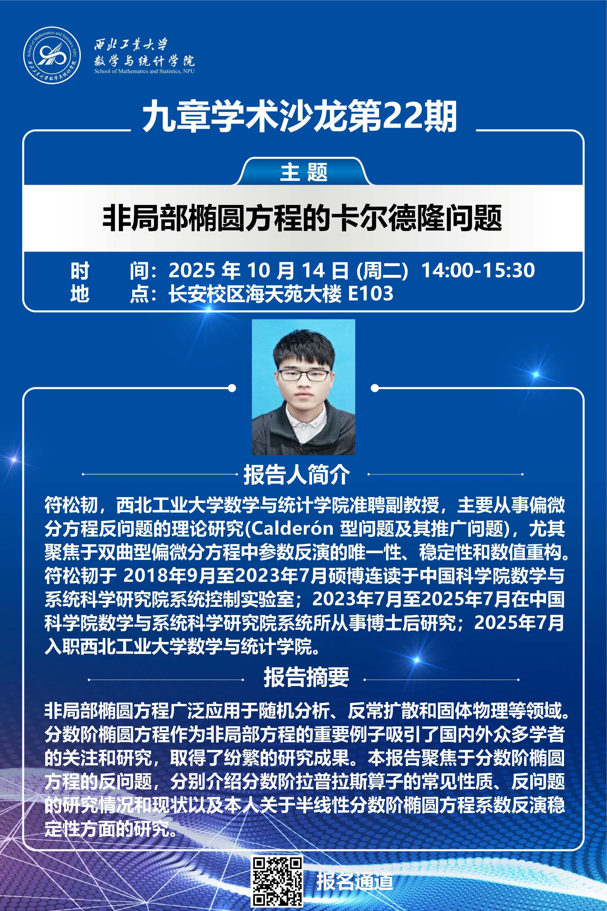 为促进学院教师之间的学术交流与合作,2025年10月14日,蜜桃直播 顺利举办第22期“九章学术沙龙”。本期活动特邀我院符松韧副教授作题为“非局部椭圆方程的卡尔德隆问题”的学术报告。报告会由夏健康副教授主持,吸引了学院十余位师生的积极参与。