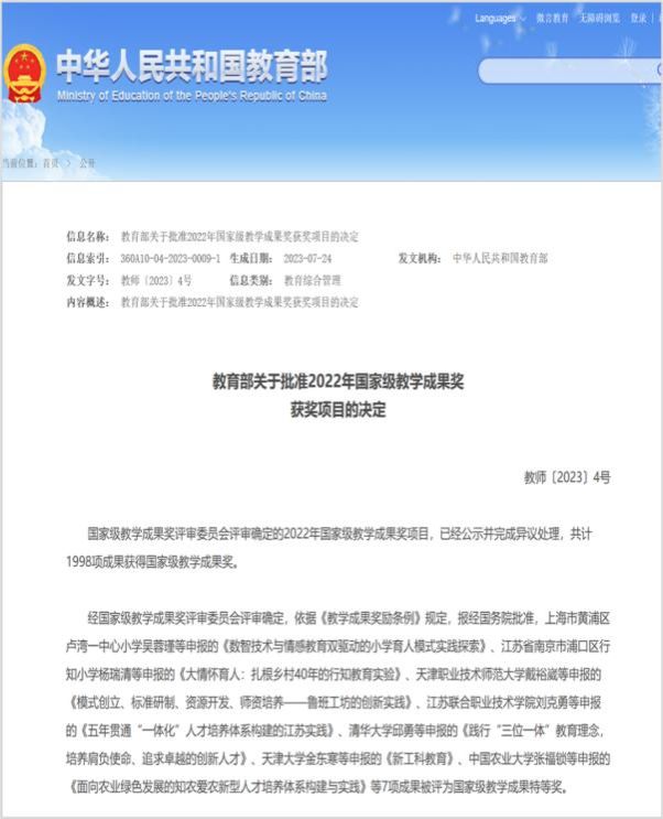 7月24日,教育部公布了2022年国家级教学成果奖获奖项目名单。我校牵头的14项教学成果荣获高等教育国家级教学成果奖!其中,蜜桃直播 作为第一完成单位获二等奖1项,作为参与单位获二等奖2项,这是我院继2014年荣获国家级教学成果奖一等奖后,再次作为第一完成单位荣获国家级教学成果奖。