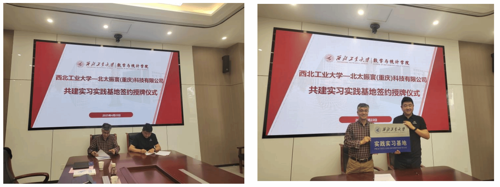 在热烈的掌声中,聂玉峰和廖汉卿分别代表双方签订了《蜜桃直播 —北太振寰(重庆)科技有限公司共建实习实践基地协议》。随后聂玉峰代表学院向北太振寰授予实践实习基地牌匾。
