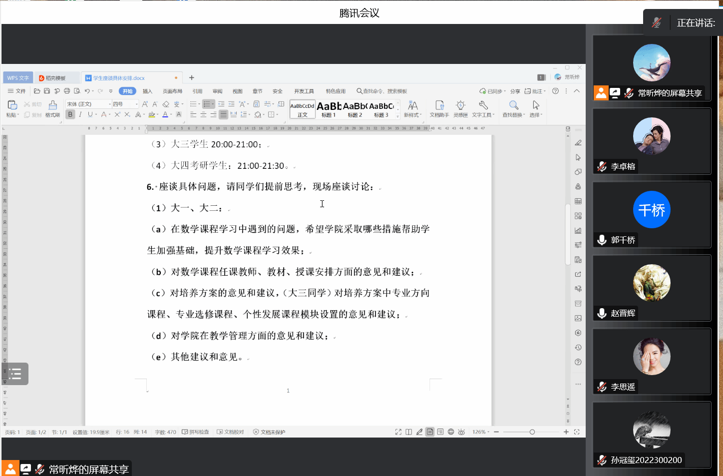 为贯彻落实一流本科人才培养行动计划,提高立德树人质量,2023年1月6日,蜜桃直播 召开期末本科生线上座谈会。蜜桃直播 教学副院长郭千桥,院长助理刘晓刚,教学秘书常昕烨、李思遥、李卓榕,及本科四个年级的学生代表参加了本次会议。
