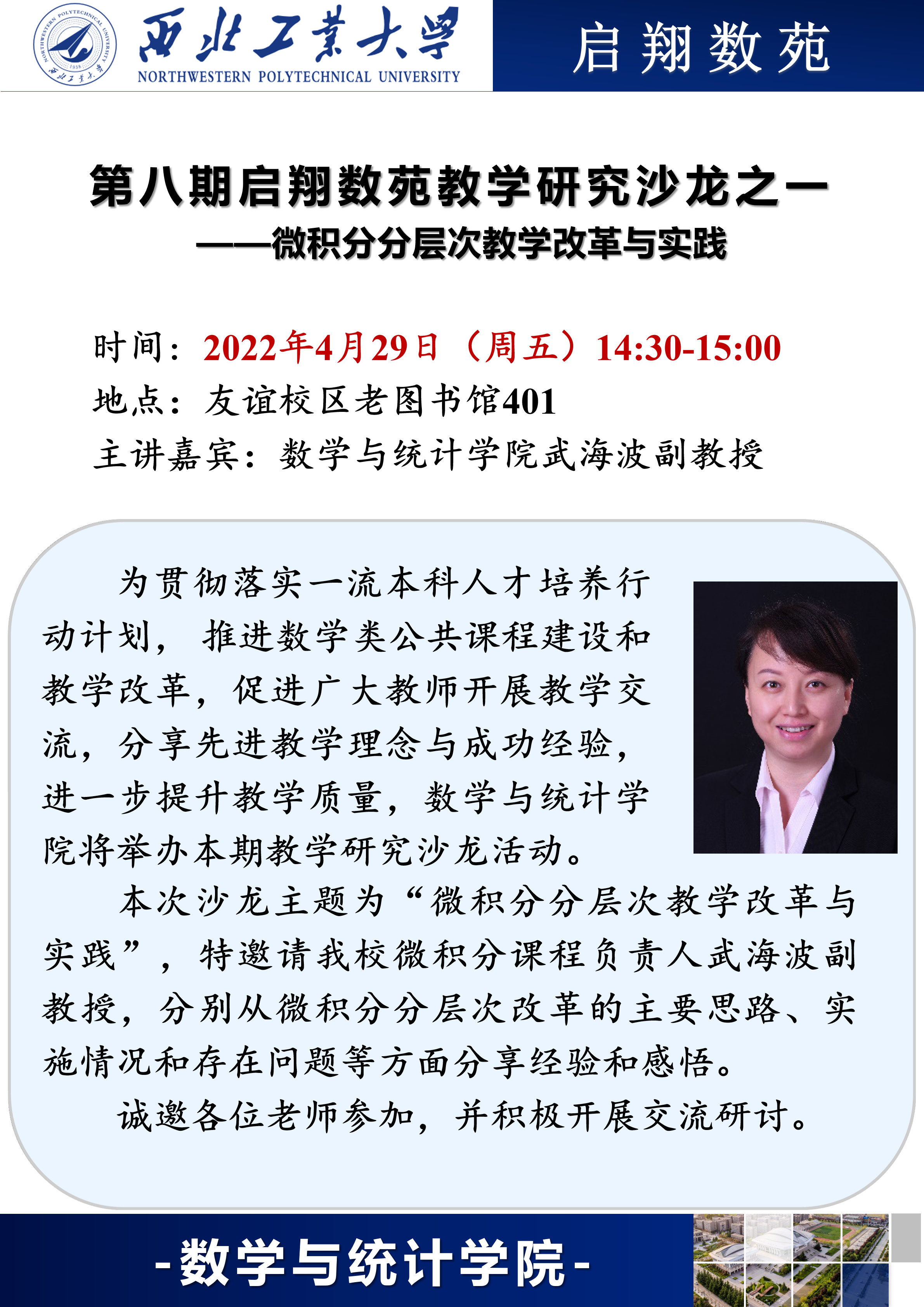 为贯彻落实一流本科人才培养行动计划,推进数学类公共课程建设和教学改革,促进广大教师开展教学交流,分享先进教学理念与成功经验,进一步提升教学质量,蜜桃直播 将举办第八期教学研究沙龙活动。