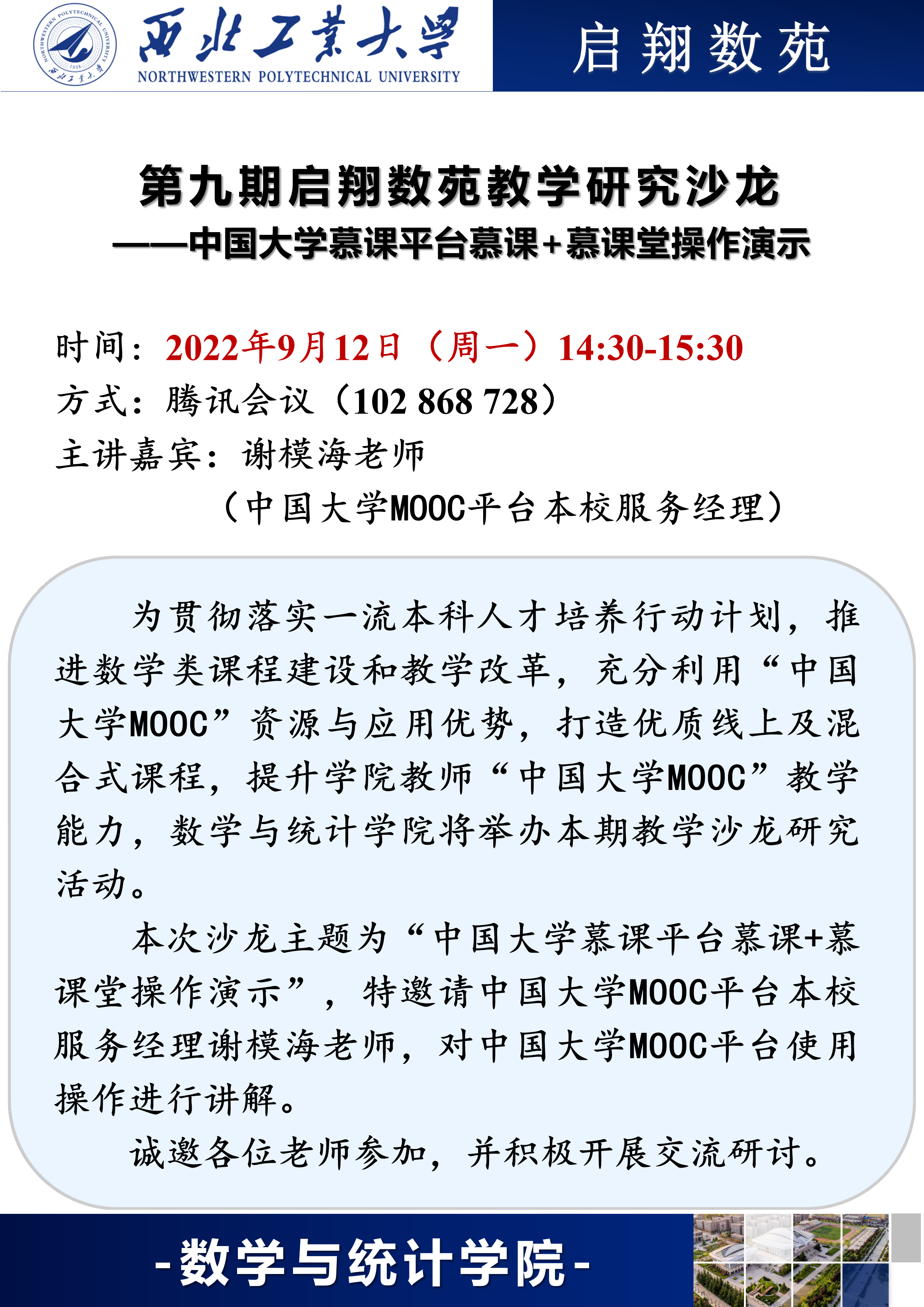 为贯彻落实一流本科人才培养行动计划,推进数学类课程建设和教学改革,充分利用“中国大学MOOC”资源与应用优势,打造优质线上及混合式课程,提升学院教师“中国大学MOOC”教学能力,蜜桃直播 将举办本期教学沙龙研究活动。