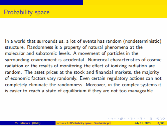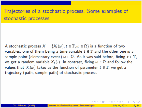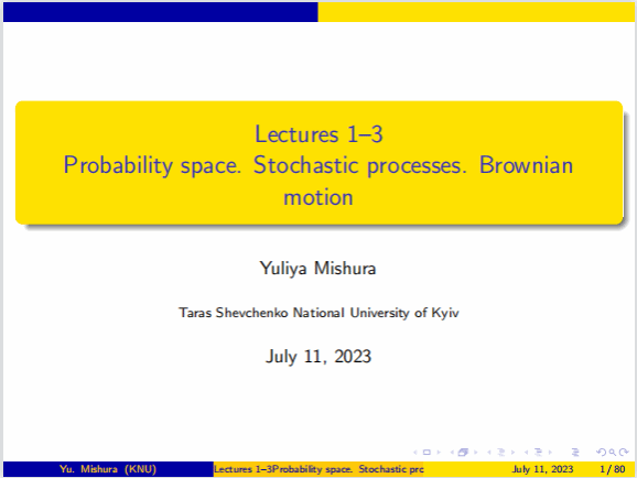 Yuliya Mishura教授首先回顾和重新定义《概率论》中的一些基本概念。包括概率空间、随机过程的定义和基本性质及其数学特征,条件期望的严格定义,以及鞅的概念与基本性质。Yuliya Mishura教授接下来介绍了此次本课程的一个重要概念布朗运动,以及布朗运动的性质、联合分布、首次命中时间和最大值的分布等内容,并由此引出随机积分和伊藤公式,通过应用伊藤公式求解随机微分方程,推导随机微分方程解的存在唯一性定理,及其强弱解的一致有界性等性质。