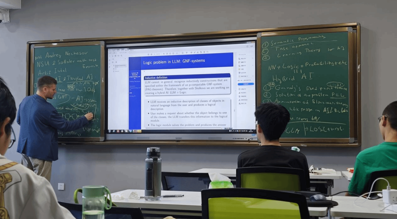 Andrey Nechesov研究员在讲台上展现出严谨认真的教学态度,他巧妙结合板书与PPT两种教学工具,为学生们呈现了一堂堂精彩纷呈的课程。他的板书字迹工整、条理清晰。在授课过程中,Nechesov研究员不仅注重理论的推导和公式的讲解,还通过大量的实例和案例分析,帮助学生更好地理解和应用所学知识。通过这门课程的学习,学生们不仅对一些基本的数学理论有了更加清晰的认识,还掌握了一些实用的研究方法和技巧。