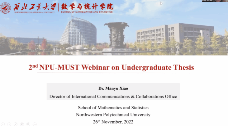 为进一步推进我院国际化工作水平,提升留学生培养质量,2022年11月26日上午10:00,蜜桃直播 与蒙古科技大学在ZOOM线上平台举行本科毕业论文工作推进会。会议由国际交流与合作办公室主任肖曼玉主持。出席本次会议的有蜜桃直播 副院长都琳、副院长郭千桥、应用概率统计系主任王亮、毕设导师王晓东、马荣、邢超(航天学院),国际交流与合作办公室秘书李卓榕,蒙古科技大学数学系主任Battsetseg Gereltbyamba、副导师ARIUNGEREL Jargal、MUNKHGEREL Tsegmid、TAIGYNTUYA Bayaraa以及3名蒙古学生。