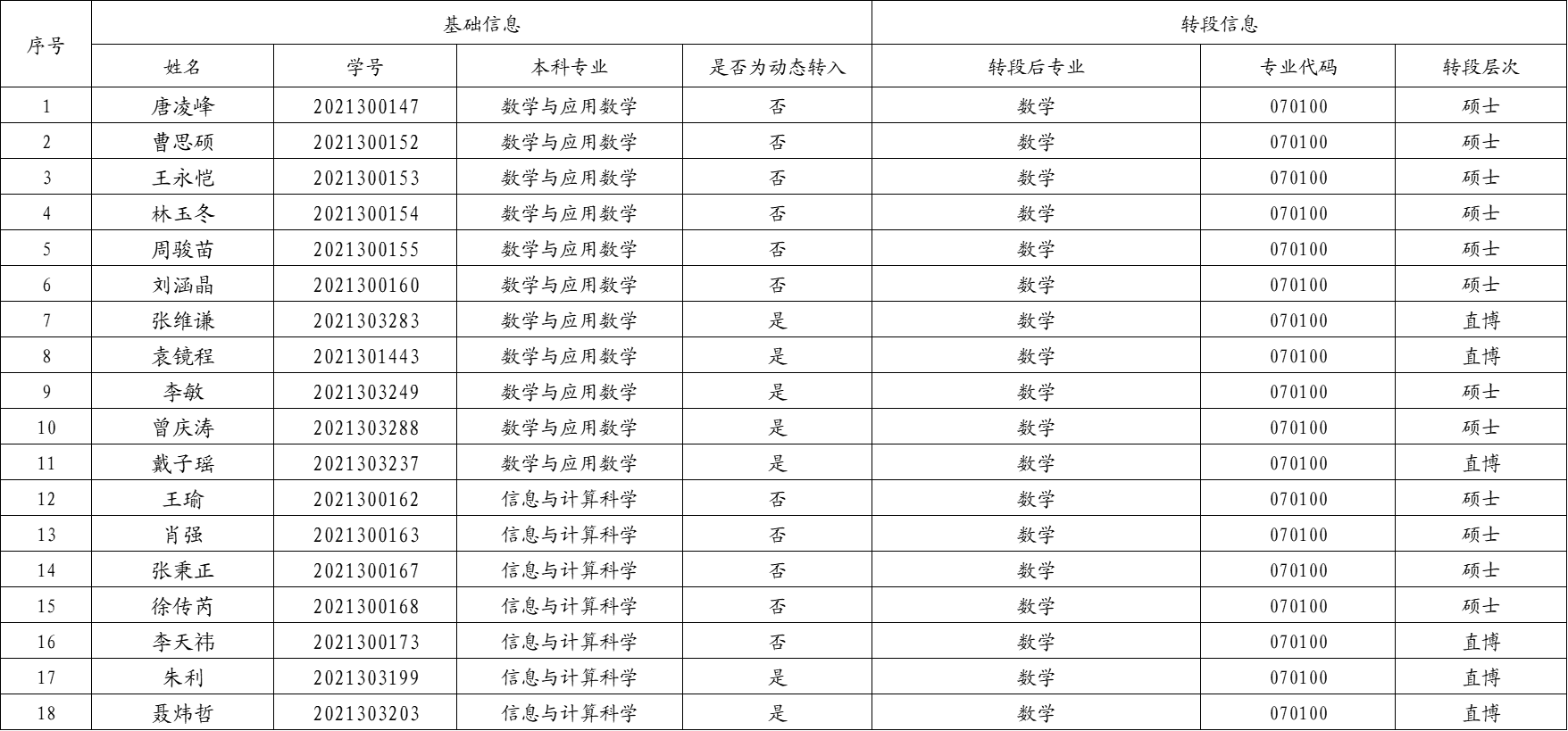 2021级强基计划转段拟录取名单公示