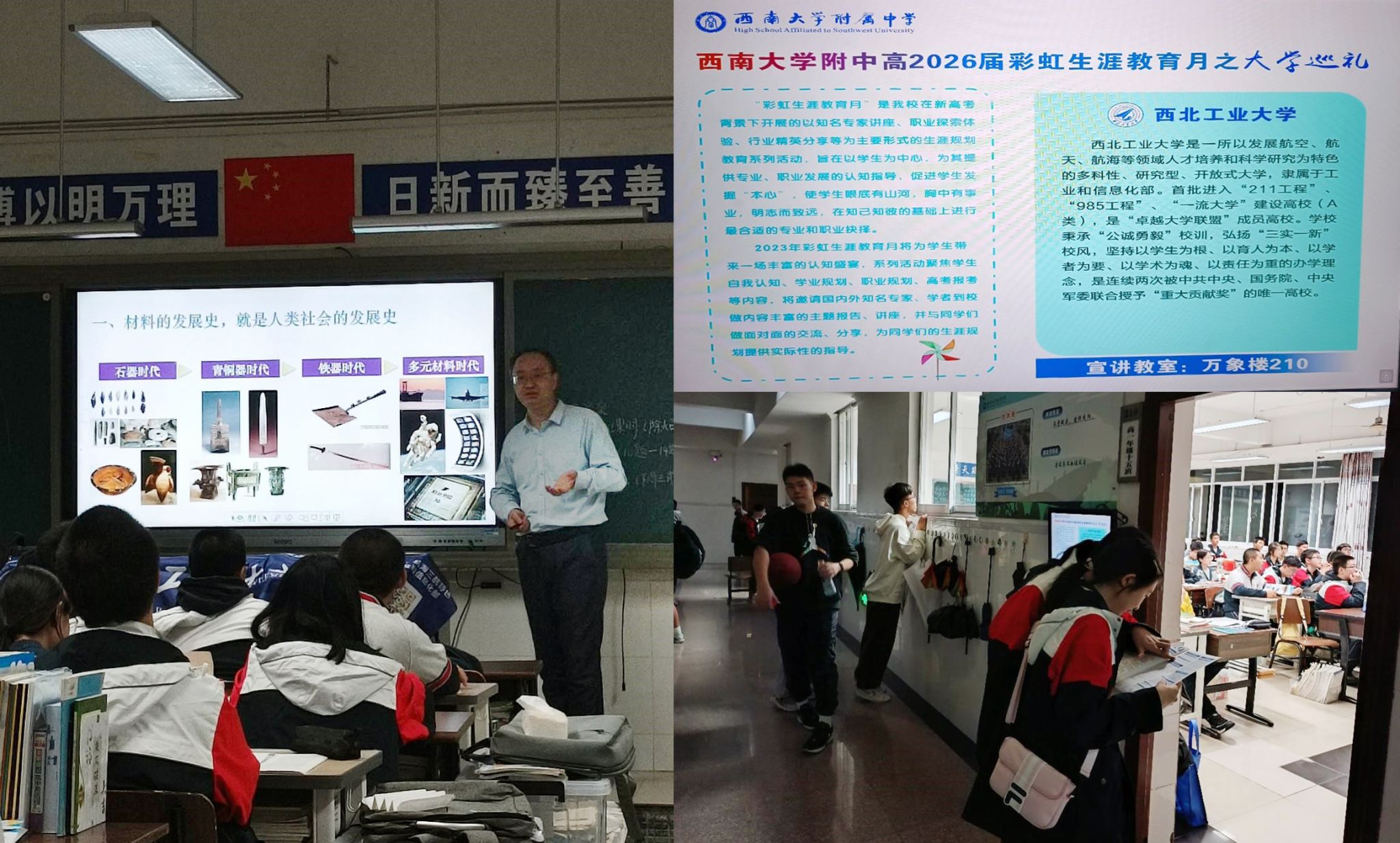 11月10日,应西南大学附中邀请,材料学院王永欣副院长、蜜桃直播 重庆招生组王振海老师前往重庆市西大附中参加高2026届彩虹生涯教育月大学巡礼活动并开展科普讲座等招生宣传工作。
