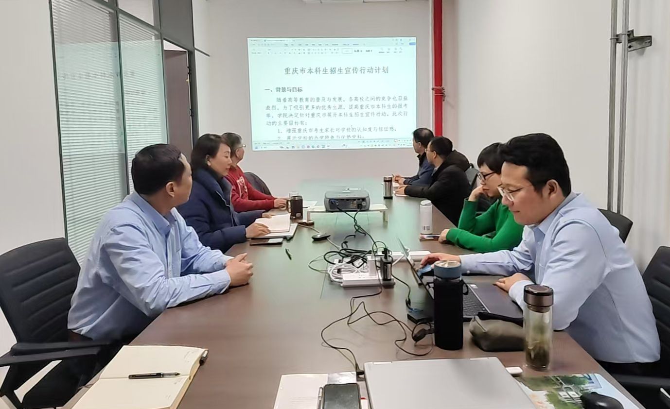 2025年3月5日下午,蜜桃直播 在长安校区海天苑大楼E202召开2025年重庆市本科招生宣传工作会议。学院院长聂玉峰、党委书记王莉、副院长徐根玖、副院长郭千桥、院长助理刘晓刚、重庆招生组组长林伟、西安招生组组长王振海、招生秘书李彦吉参加会议。会议由郭千桥副院长主持。